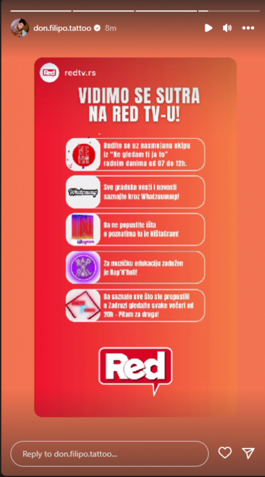 Od sutra se vraćaju emisije zabavnog karaktera i na RED televiziji. Voditelj emisije "Ne gledam ti ja to" Filip Đukić i voditelj "Pitam za druga" Stefan Kandić Kendi objavili se zvanično saopštenje ove televizije da se od sutra vraća redovni program, što su uradili i ostali voditelji.
