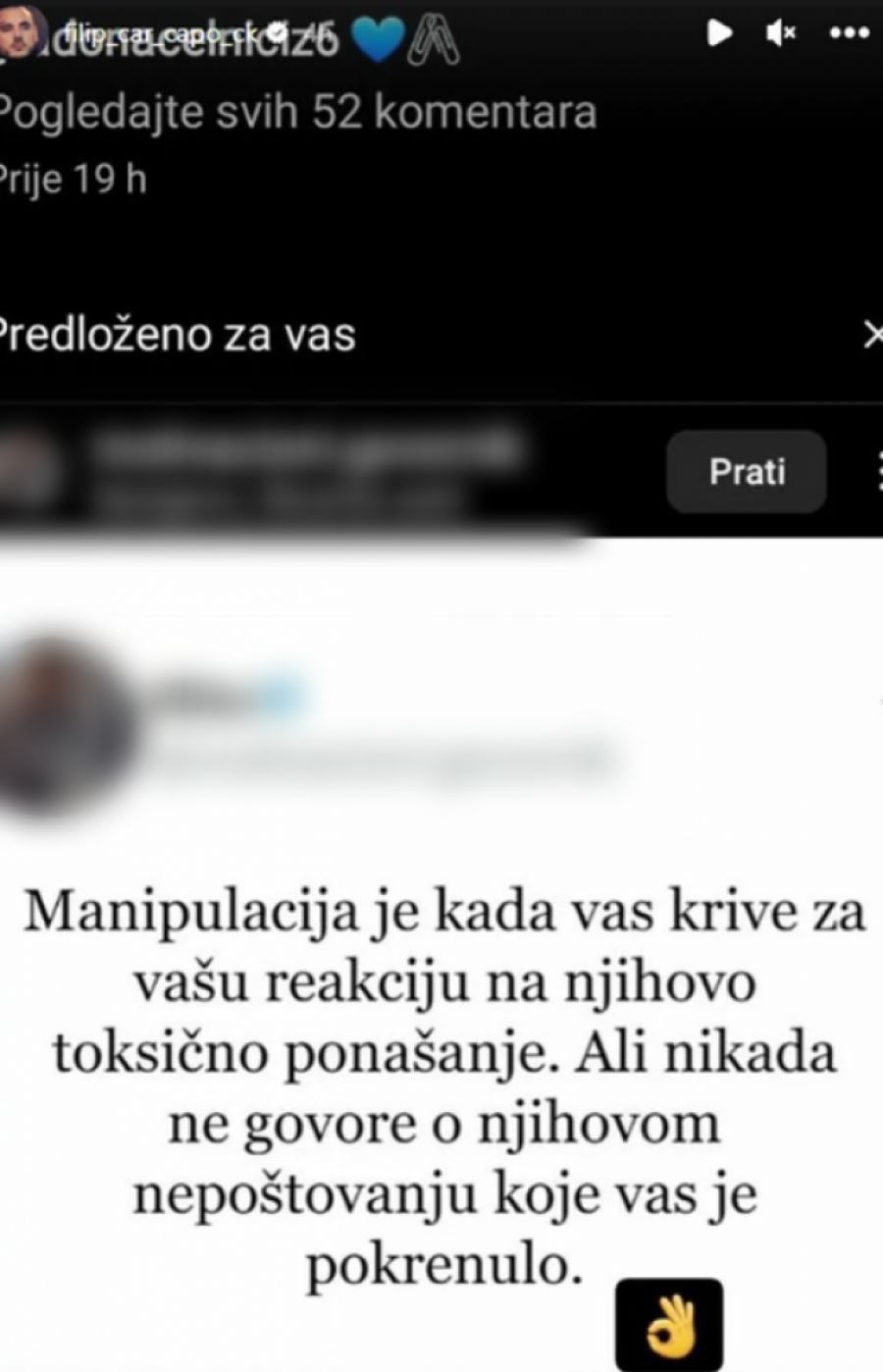 - Manipulacija je kada vas krive za vašu reakciju na njihovo toksično ponašanje, ali nikada ne govore o nepoštovanju koje vas je pokrenulo - pisalo je u objavi, a Filip je dodao, emodži u vidu odobravanja, piše Pulsonline.