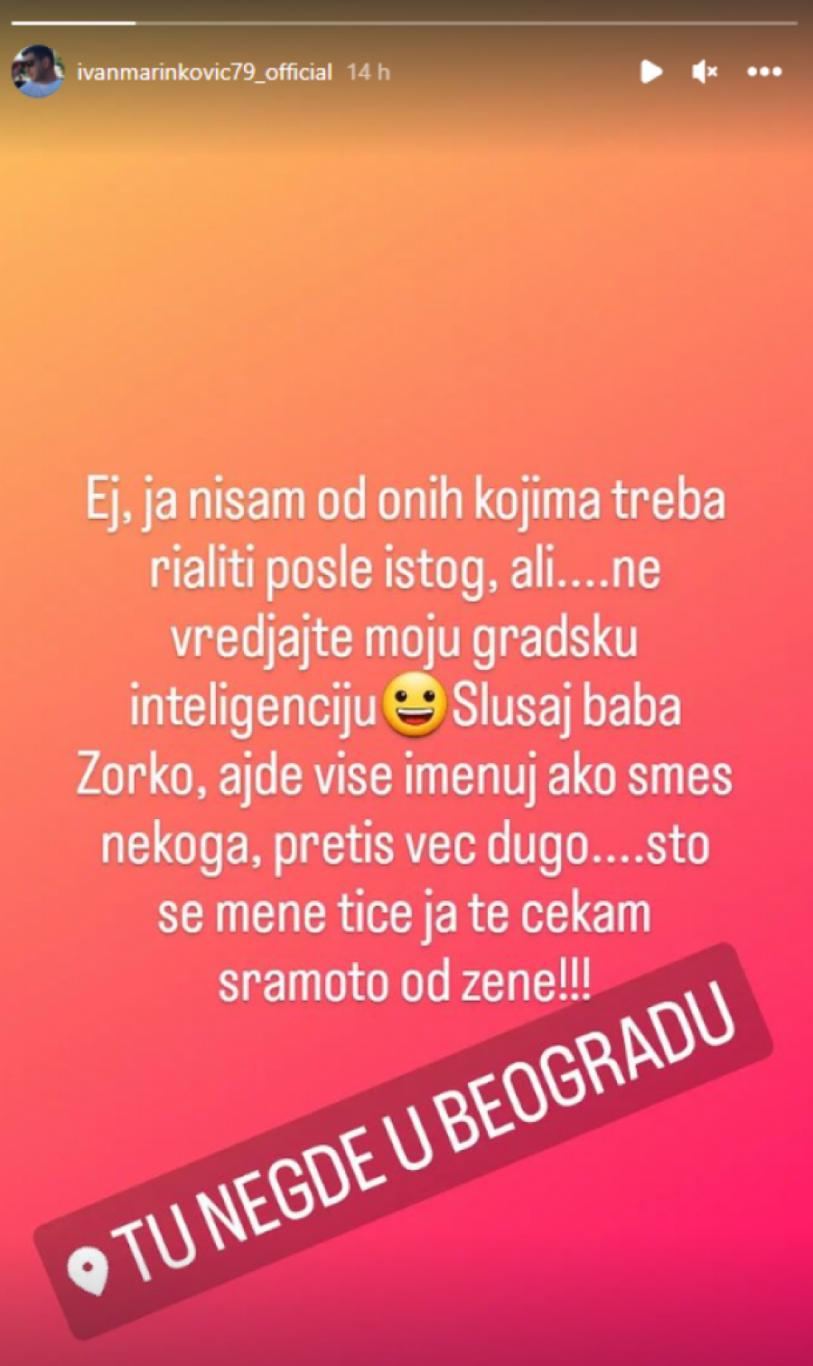- Ej, ja nisam od onih kojima treba rijaliti psoel istog, ali ne vređajte moju gradsku inteligenciju. Slušaj baba Zorko, ajde više imenuj ako smeš nekoga, pretiš već dugo... Što se mene tiče, ja te čekam sramoto od žene - napisao je Marinković, uz lokaciju ,,Tu negde u Beogradu".