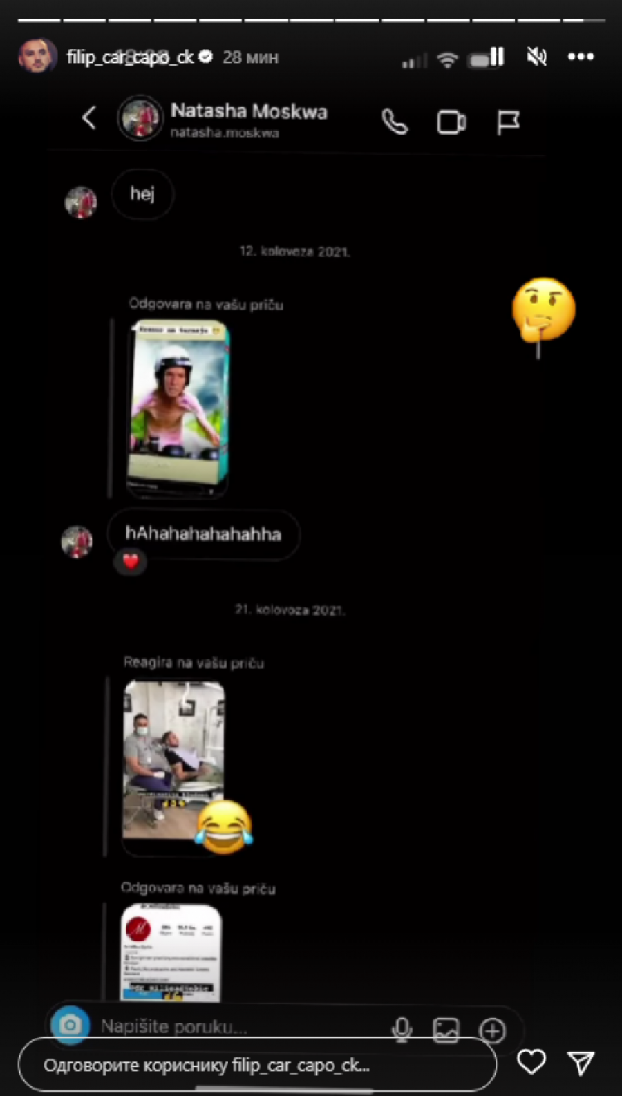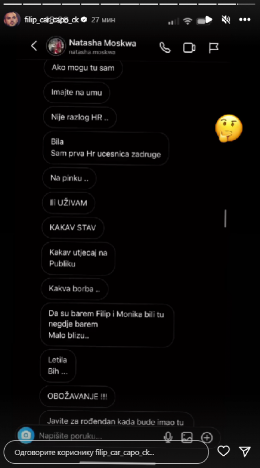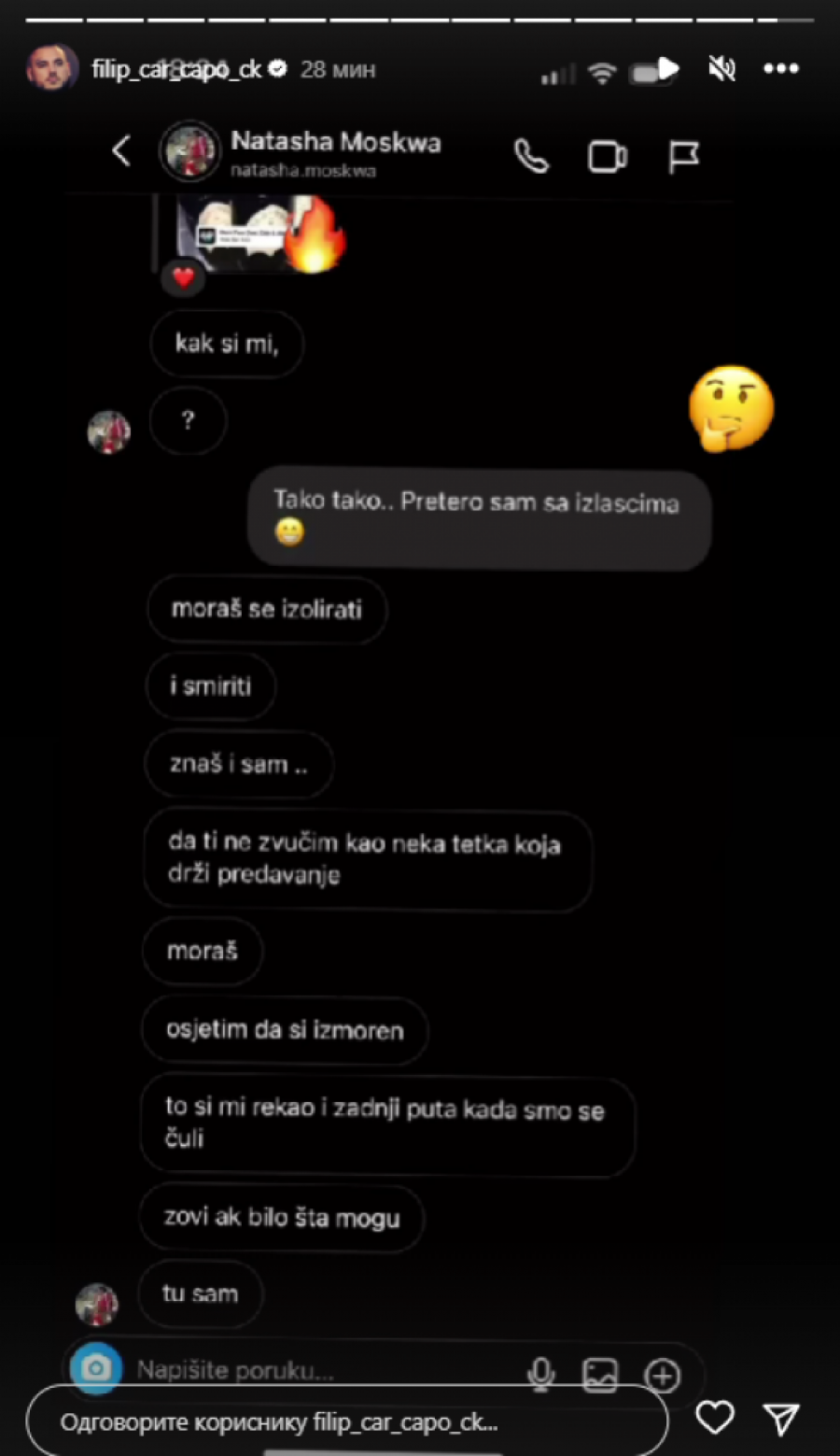 Starleta Nataša Moskva razgovarala je sa Anđelom Đuričić o svom odnosu i dopisivanju sa Filipom Carem, što je žestoko razljutilo bivšeg zadrugara. Prvo je potkačio obe, a zatim objavio nove prepiske sa Moskvom, gde se vidi koliko mu je pisala pre nego što joj je odgovorio.