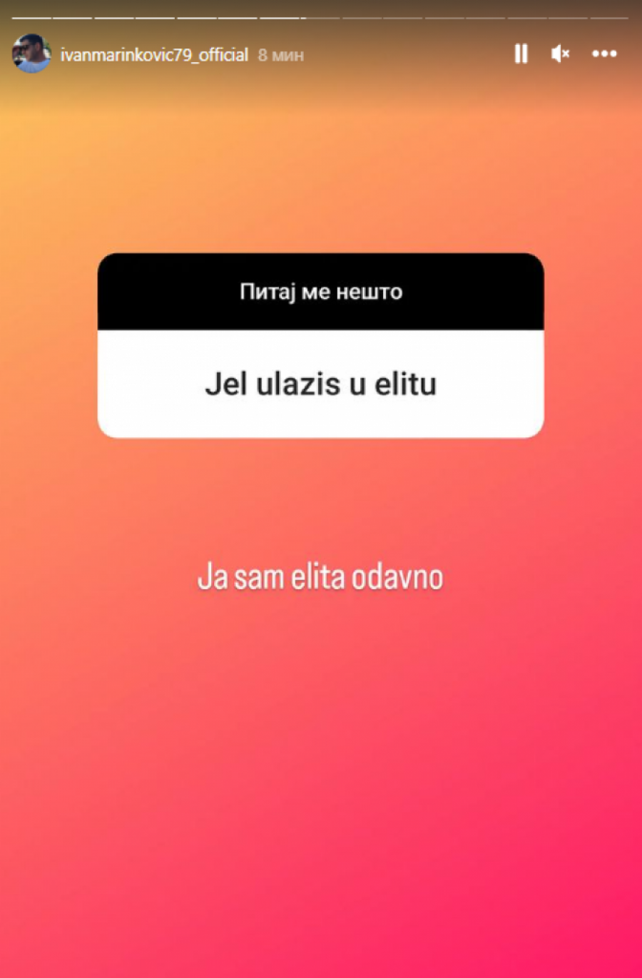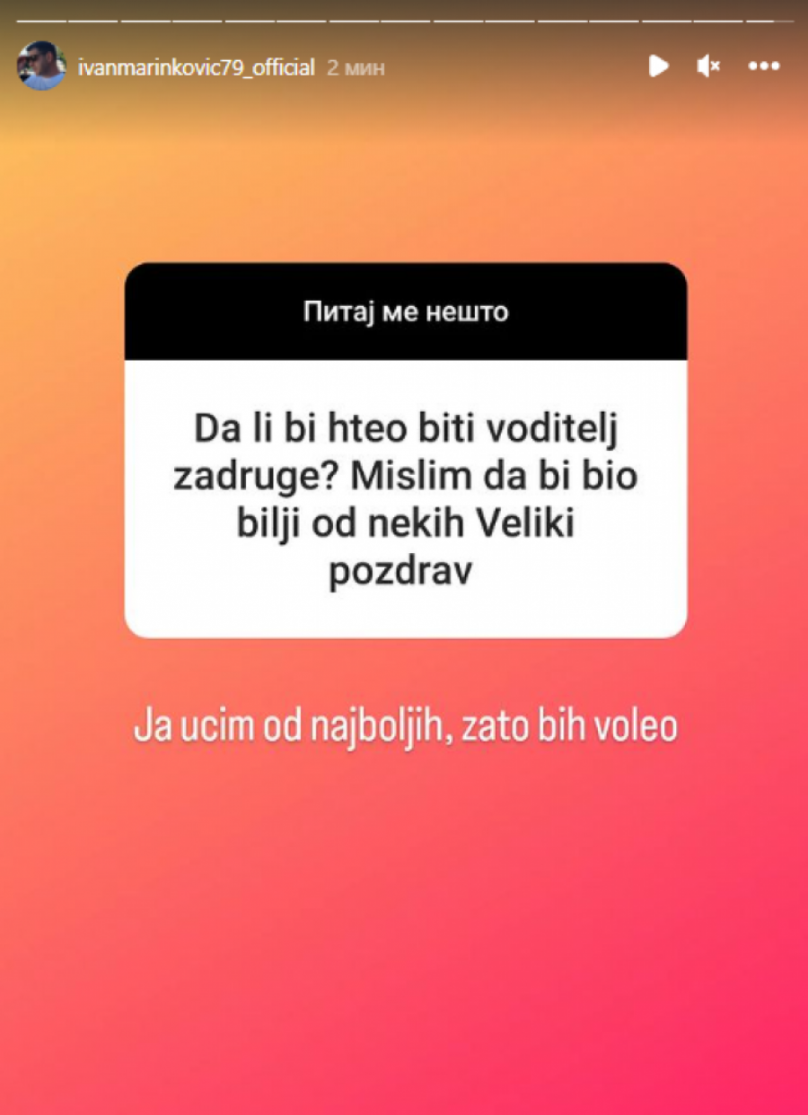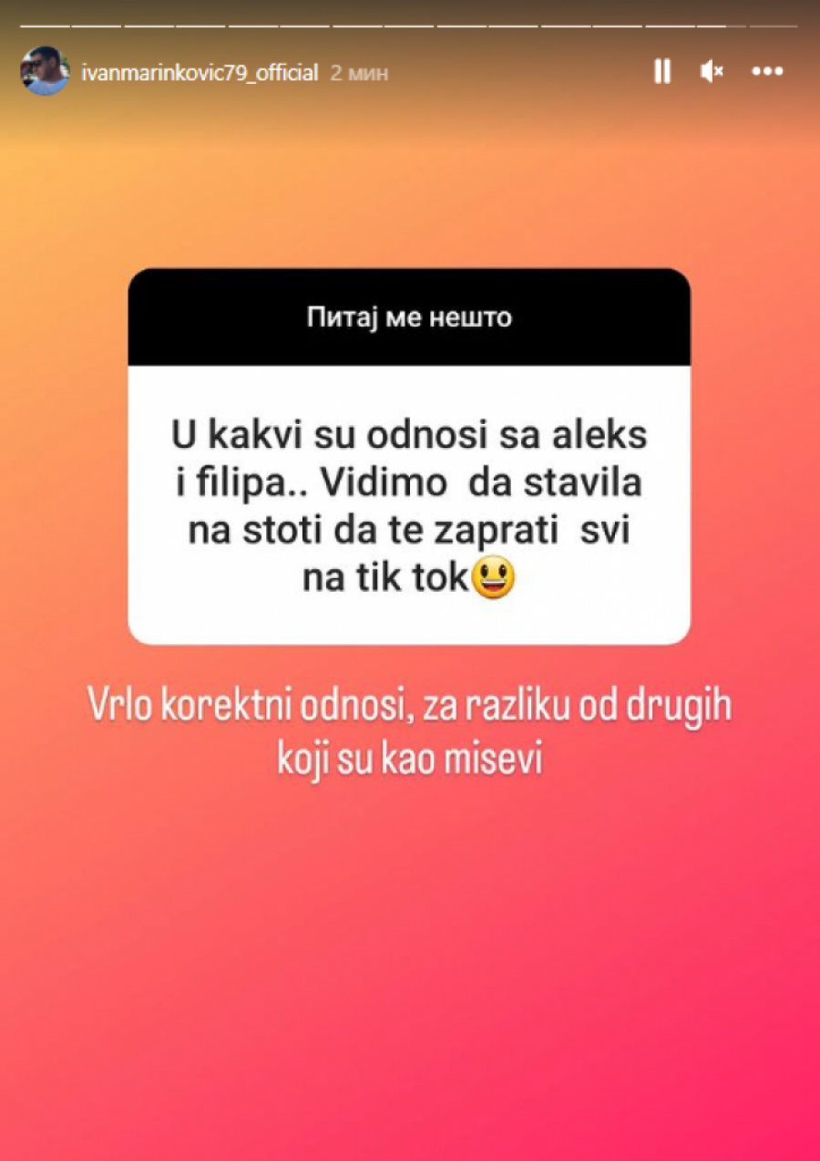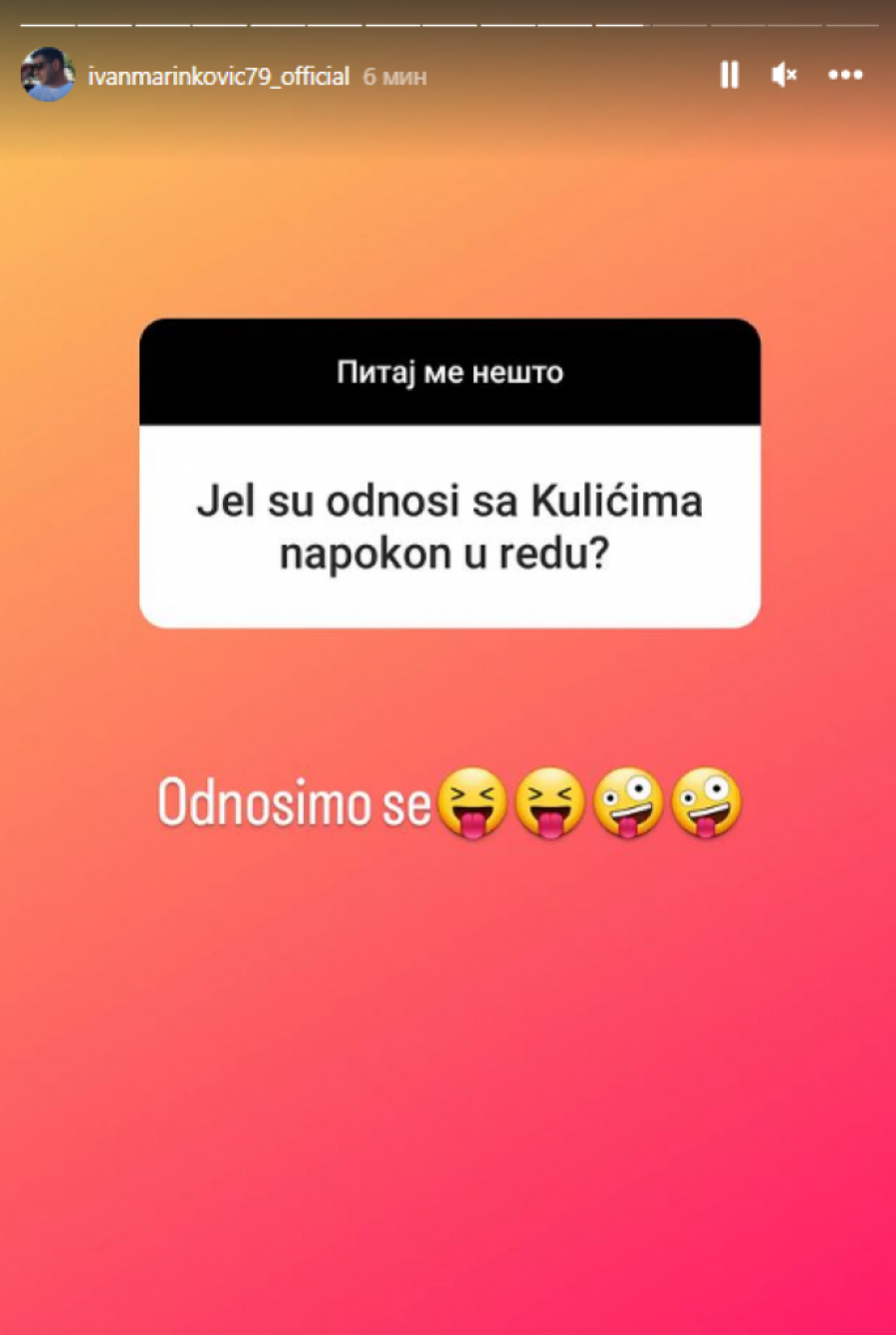 Bivši zadrugar Ivan Marinković često komunicira sa publikom putem svog Instagram profila, a danas je iskoristio priliku da odgovara na pitanja svojih fanova. Između ostalog, otkrio je šta se dešava sa tužbom Zorice Marković, da li ulazi u "Zadrugu 7 Elita", da li je dobio ponudu da postane voditelj, ali i u kakvom je odnosu sa porodicom Kulić.
