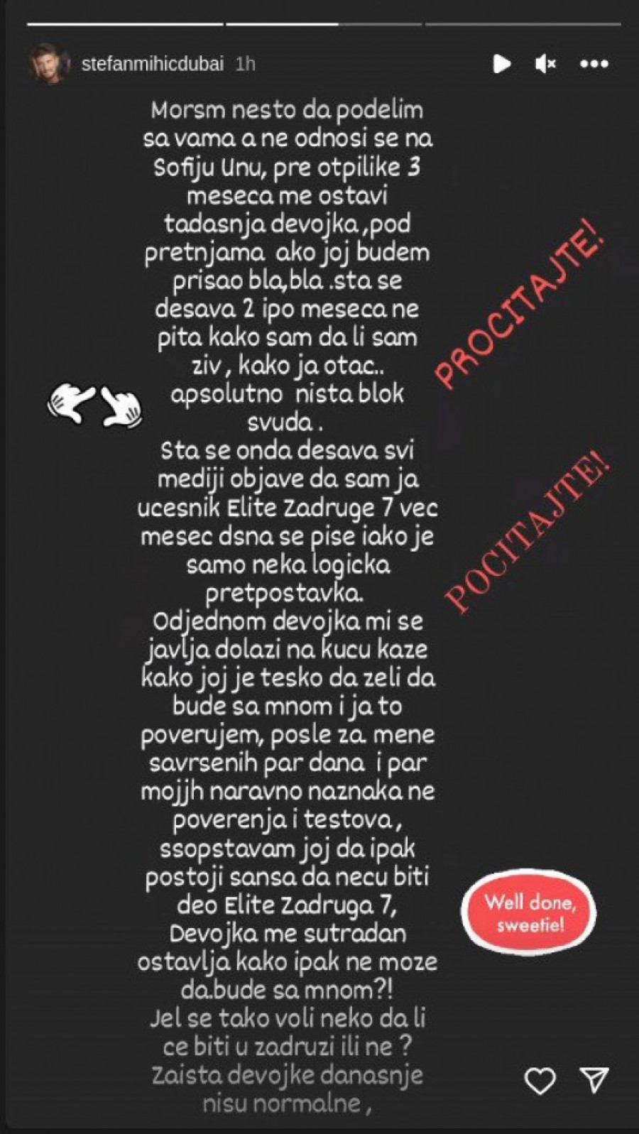 - Moram nešto da podelim sa vama, a ne odnosi se na Sofija Unu. Pre otprilike tri meseca me ostavi tadašnja devojka, pod pretnjama ako joj budem prišao bla, bla. Šta se dešava? Dva i po meseca ne pita kako sam, da li sam živ, kako je otac, asolutno ništa, blok svuda. Šta se onda dešava? Svi mediji objave da sam ja učesnik "Zadruge 7 elita". Već mesec dana se piše iako je to samo neka logička pretpostavka. Odjednom mi se devojka javlja, dolazi na kuću, kaže kako joj je teško, da želi da bude sa mnom i ja u to poverujem. Posle za mene savršenih par dana i posle par mojih naznaka nepoverenja i testova, saopštavam joj da ipak postoji šansa da neću biti deo "Elite Zadrufa 7". Devojka me sutradan ostavlja kako ipak ne može da bude sa mnom. Je l' se tako voli neko? Da li će biti u Zadruzi ili ne? Zaista današnje devojke nisu normalne - napisao je Mihić i dodao: