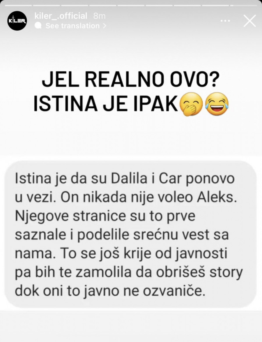- Istina je da su Dalila i Car ponovo u vezi. On nikada nije voleo Aleks. Njegove stranice su to prve saznale i podelile srećnu vest sa nama. To se još krije od javnosti, pa bih te zamolila da obrišeš stori, dok oni to javno ne ozvaniče - glasi poruka, koju je jedna Instagram stranica objavila.