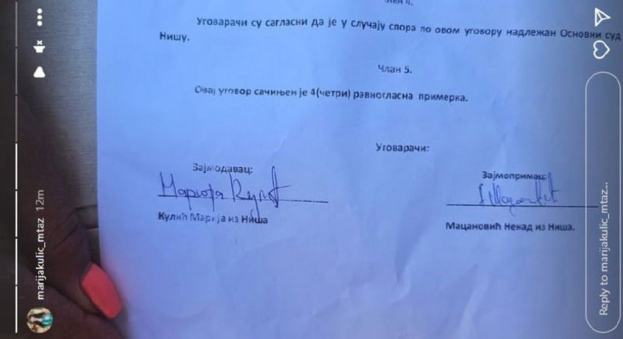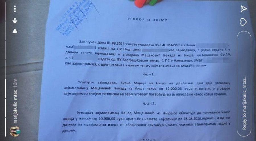 Prva stvar koju je Miljana potom uradila je raskrinkavanje Nenada Macanovića Bebice, sa kojim je sinoć raskinula. Miljana je priložila ugovor koji je Bebica potpisao sa Marijom. U ugovoru stoji da mu je Marija pozajmila 10.000 evra, a prenosimo ga u celosti.