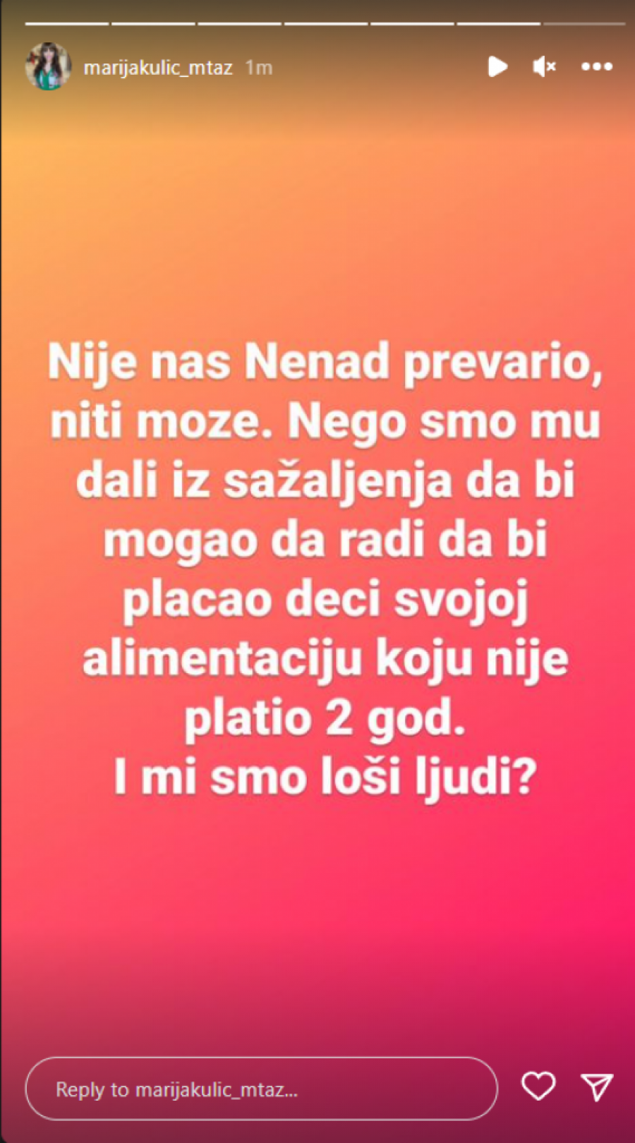 - Evo za sve koji ne veruju. A dole piše Nenad Macanović iz Niša, zbog toga što smo beskućnika koji nije imao ni adresu stanovanja, mi prijavili i odjavićemo ga u ponedeljak. Čim je uzeo pare, pobegao je. Nema veze, moji roditelji su hteli da mu pomognu, jer nije plaćao deci alimentaciju uopšte. Nije nas Nenad prevario, niti može, nego smo mu dali iz sažaljenja da bi mogao da radi da bi plaćao deci svojoj alimentaciju, koju nije platio dve godine. i mi smo loši ljudi? - napisala je Miljana.