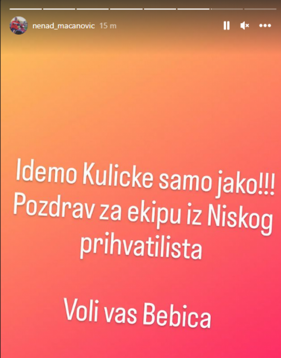 - Idemo Kulićke samo jako!!! Pozdrav za ekipu iz Niškog prihvatilišta! Voli vas Bebica- napisao je Nenad Macanović.