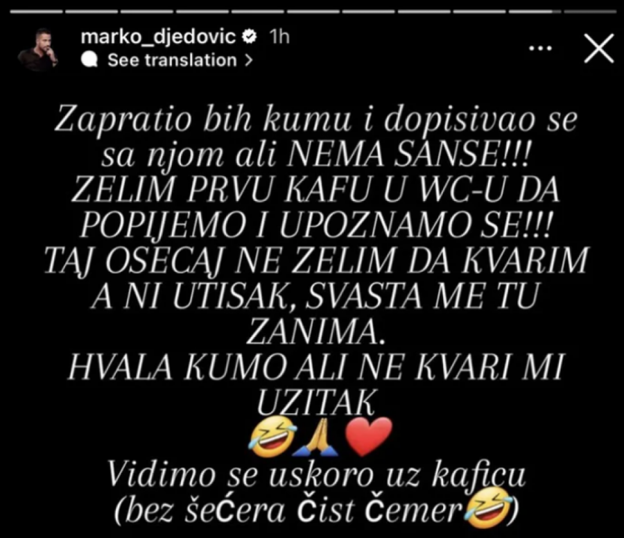 - Zapratio bih kumu i dopisivao se sa njom, ali nema šanse!!! Želim prvu kafu u wc-u da popijemo i upoznamo se!!! Taj osećaj ne želim da kvarim, a ni utisak, svašta me tu zanima. Hvala kumo, ali ne kvari mi užitak. Vidimo se uskoro uz kaficu (bez šećera čist čemer) - napisao je Marko na svom Instagram storiju.
