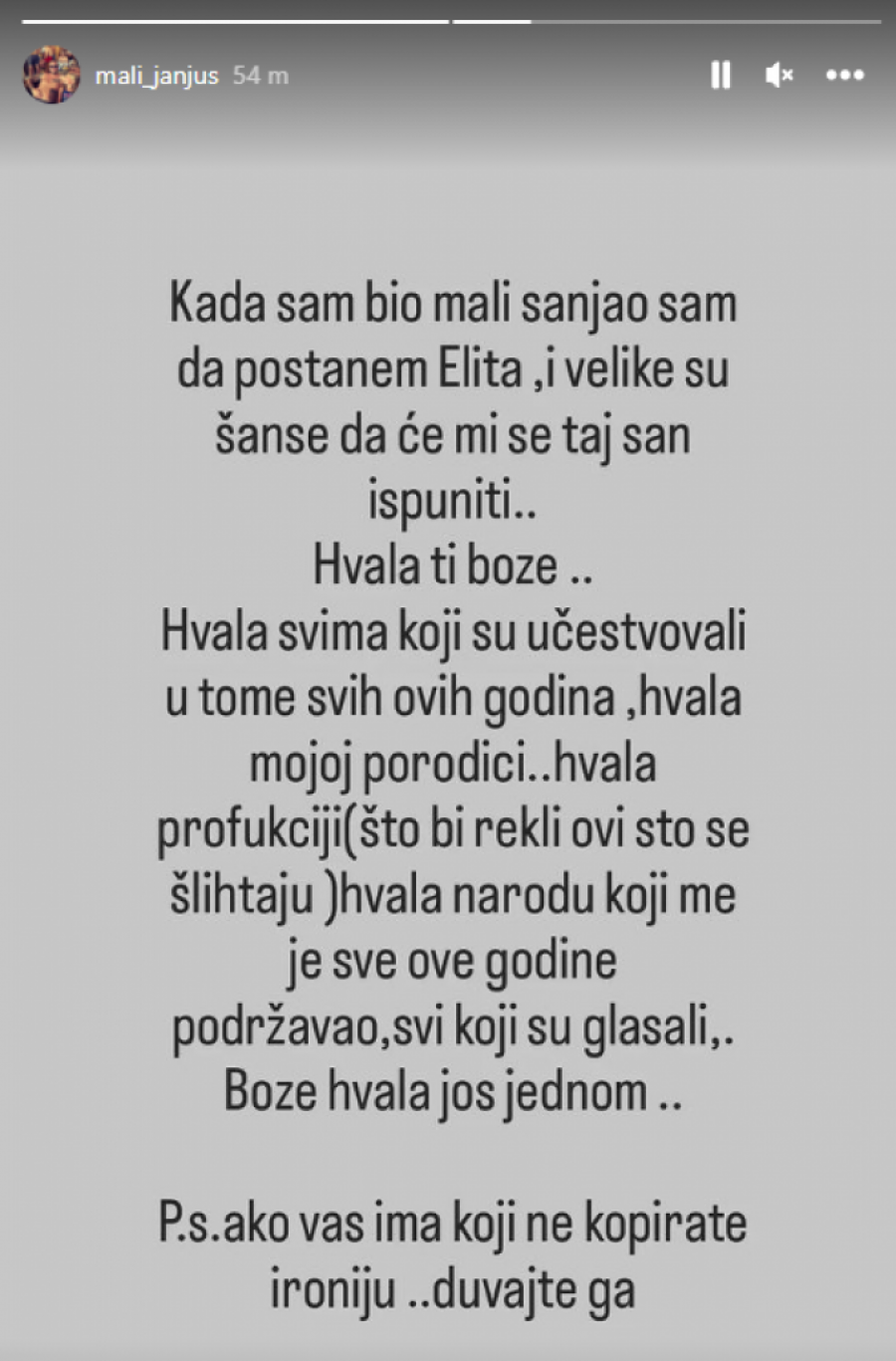 - Kada sam bio mali, sanjam sam da postanem Elita. I velike su šanse da će mi se taj san ispuniti. Hvala ti bože, hvala svima koji su učestvovali u tome svih ovih godina, hvala mojoj porodici. Hvala produkciji, što bi rekli ovi što se šlihtaju, hvala narodu koji me je sve ove godine podržavao, svi koji su glasali. Bože, hvala još jednom. Ako vas ima koji ne kapirate ironiju... D*vajte ga - napisao je Janjuš na Instagramu.