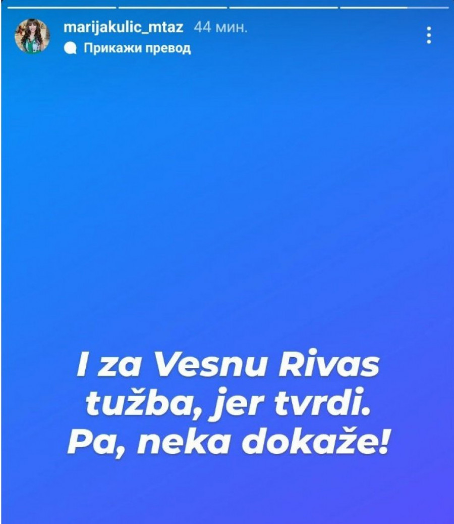 - I za Vesnu Rivas tužba, jer tvrdi. Pa, neka dokaže - odbrusila je Miljana Kulić na Instagram storiju.