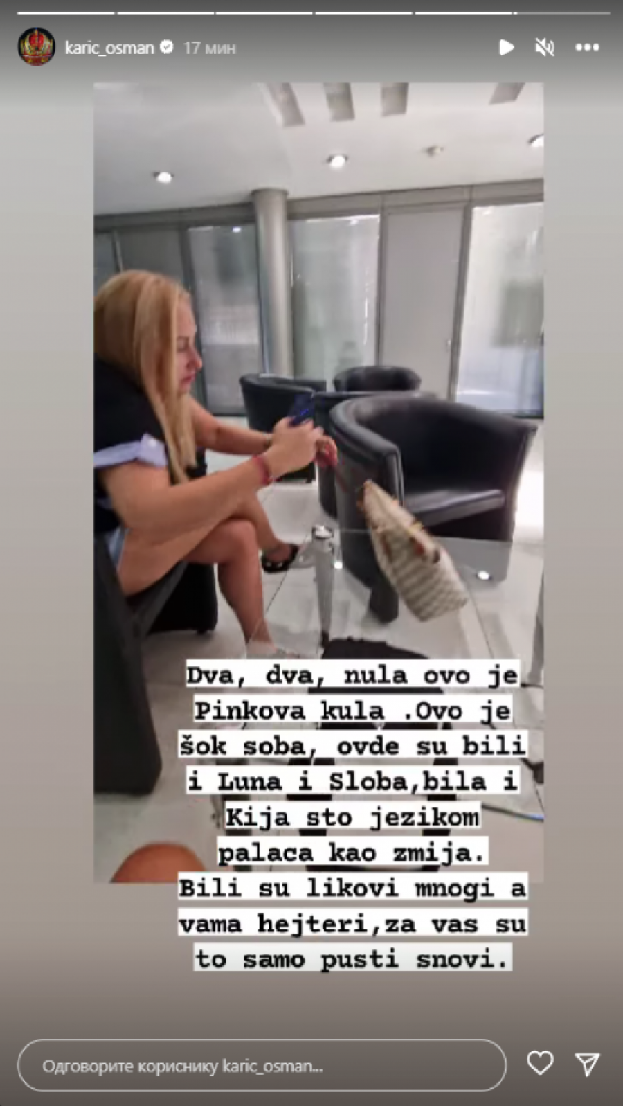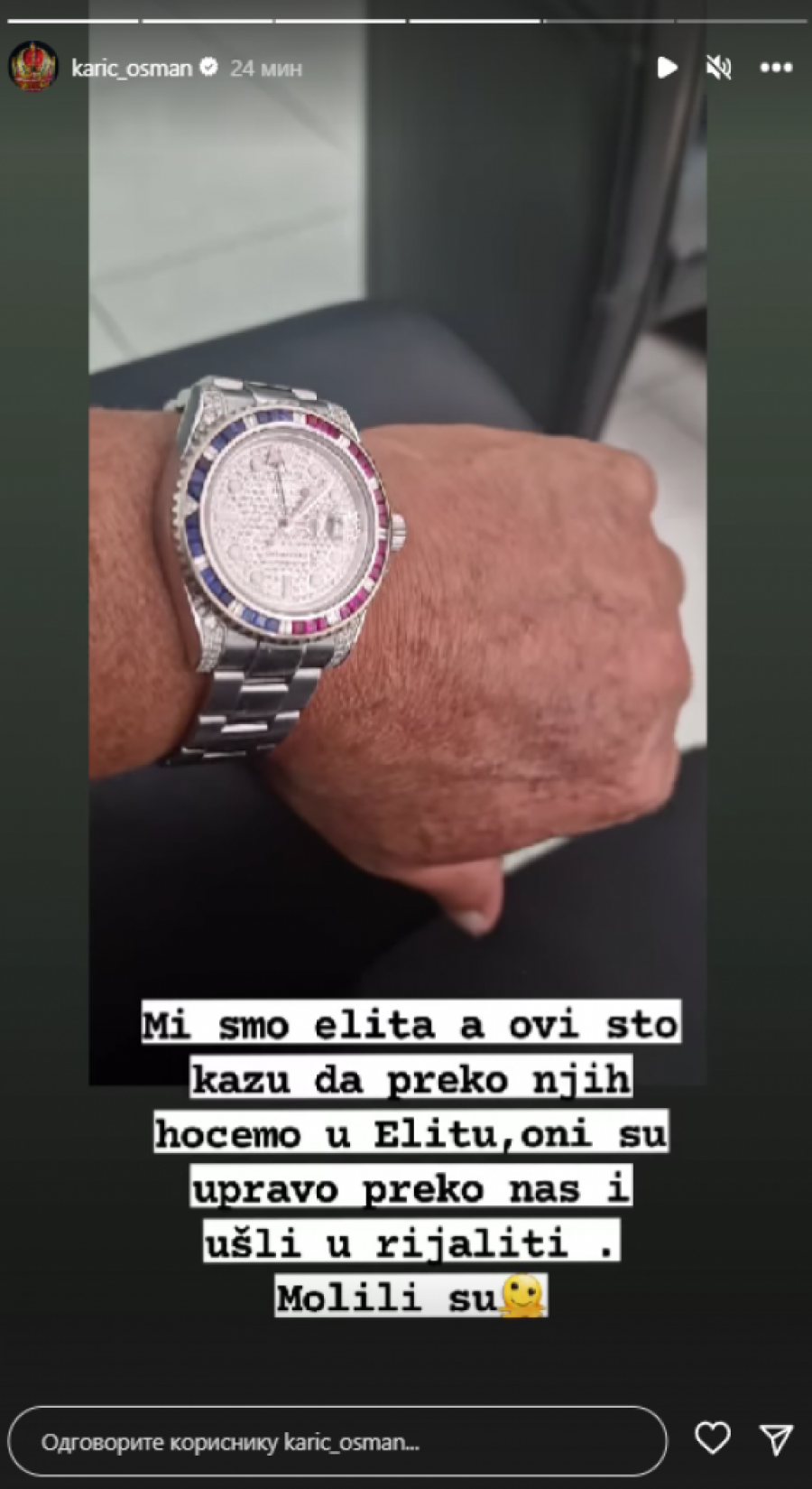 - Mi smo elita, a ovi što kažu da preko njih hoćemo u "Elitu", oni su upravo preko nas i ušli u rijaliti. Molili su - napisao je Osman, te usnimio kako sedi u zgradi Pinka i pokazuje svoj skupoceni sat.