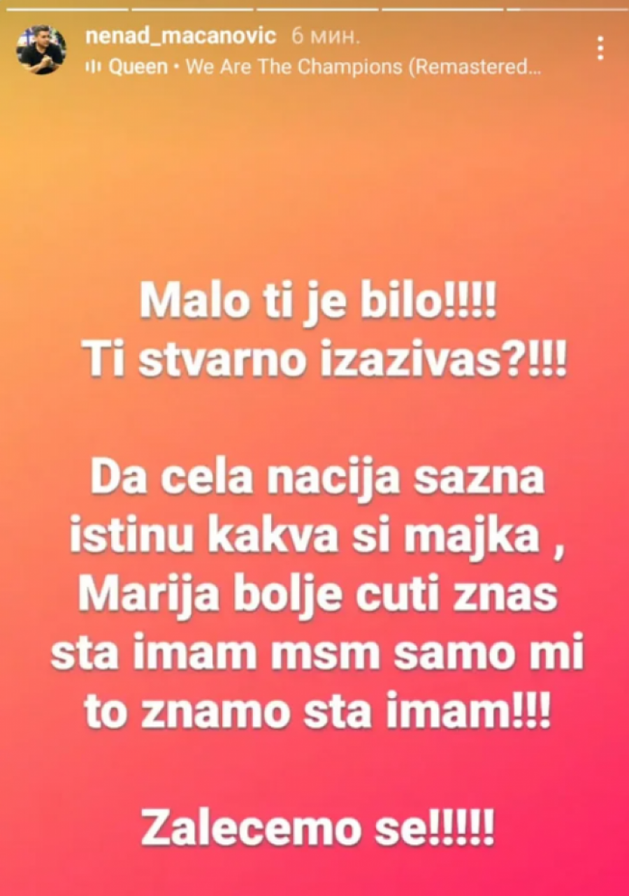 O rasidu Nenada Macanovića Bebice i Miljane Kulić javnost svakodnevno bruji. Bivši par se trudi da iz dana u dan iznese brojne informacije o suprotnoj strani, kako bi dokazali svoju ispravnost. No, ovog puta, Bebica je na svom Instagramn prifilu odlučio da se obrati njenoj mami, Mariji Kulić i uputi dvosmislenu poruku, kojom joj poručuje da ima dokaze koje može pustiti u etar.