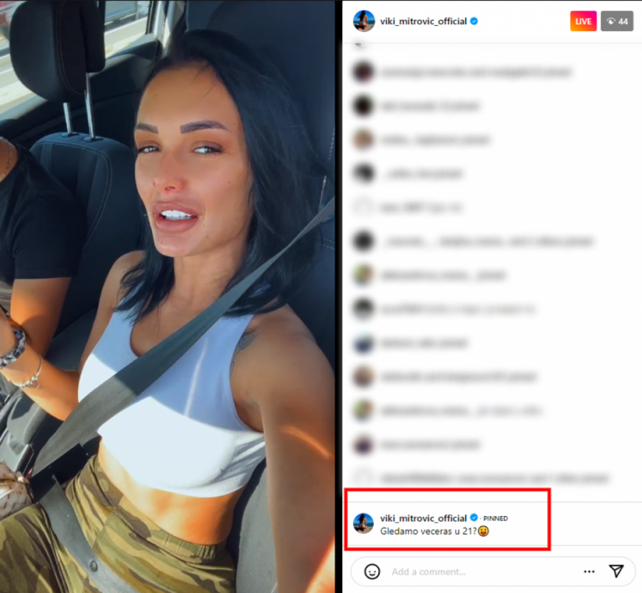 Viktorija Mitrović na svom Instagram profilu najavila svoj povratak u ,,Elitu". Ona se snimala preko uživo prenosa, a zakačila je poruku ,,Gledamo večeras u 21h?", čime je samo potkrepila pisanja da će i ona večeras postati učesnica ,,Elite", budući da je poznato da počinje u 21 čas.