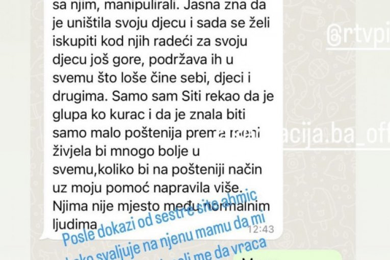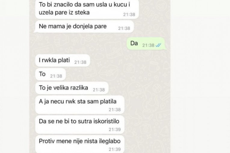 - To bi značilo da sam ja ušla u kuću i uzela pare iz šteka. Ne, mama je donela pare i rekla da plati, to je velika razlika. Protiv mene nije ništa ilegalno, već neka situacija, nebitno sada, ali ja ukrala nisam ništa - glasile su poruke koje je Anelina sestra pisala Asminu.