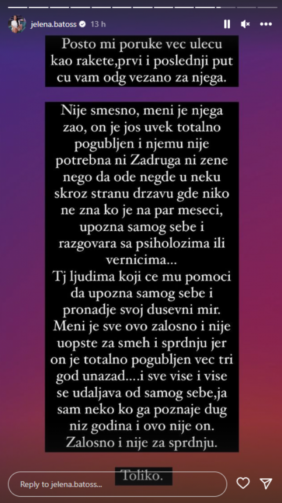 - Pošto mi poruke već uleću kao rakete, prvi i poslednji put ću vam odgovoriti vezano za njega. Nije smešno, meni je njega žao, on je još uvek totalno pogubljen i njemu nije potrebna ni Zadruga, ni žene, nego da ode negde u neku skroz stranu državu gde niko ne zna ko je na par meseci, upozna samog sebe i razgovara sa psiholozima ili vernicima, tj. ljudima koji će mu pomoći da upozna samog sebe i pronađe svoj duševni mir. Meni je sve ovo žalosno i nije za smeh i sprdnju, jer on je totalno pogubljen već tri godine unazad. I sve više i više se udaljava od samog sebe, ja sam neko ko ga poznaje dugi niz godina i ovo nije on - napisala je Jelena na Instagramu.