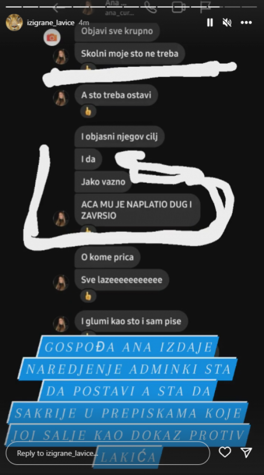 Kako je drugoplasirana zadrugarka zaratila i sa adminkama, koje su vodile njenu fan-grupu, a sada iznose šokantne informacije o Ani, na društvenim mrežama pojavile su se nove prepiske, u kojima Ana zahteva od fanova da objave njenu stranu priče na temu odnosa sa Nikolom Lakićem.