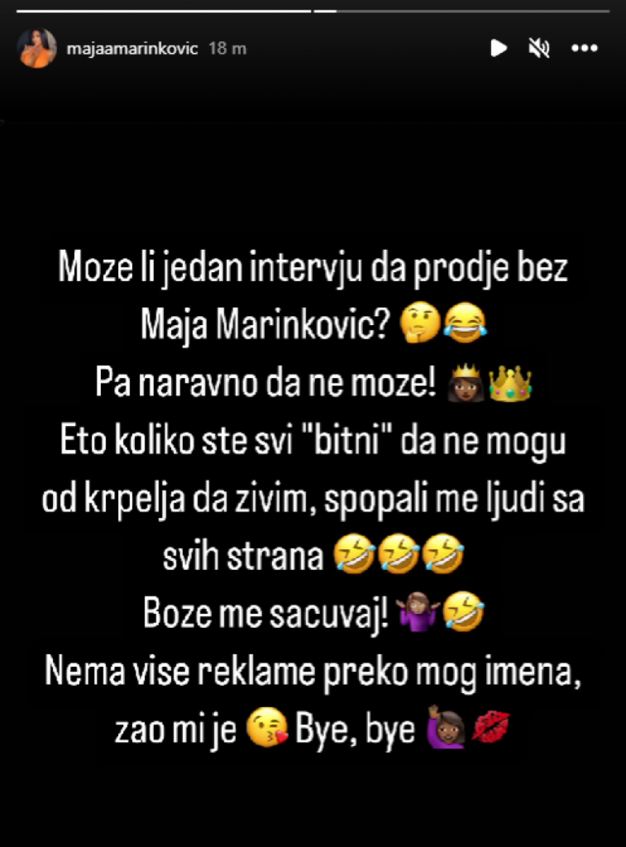 - Može li jedan intervju da prođe bez Maje Marinković? Pa naravno da ne može! Eto koliko ste vi ,,bitni" da ne mogu od krpelja da živim, spopali me ljudi sa svih strana. Bože me sačuvaj! Nema više reklame premo mog imena, žao mi je. Ćao, ćao - napisala je Maja na Instagramu.