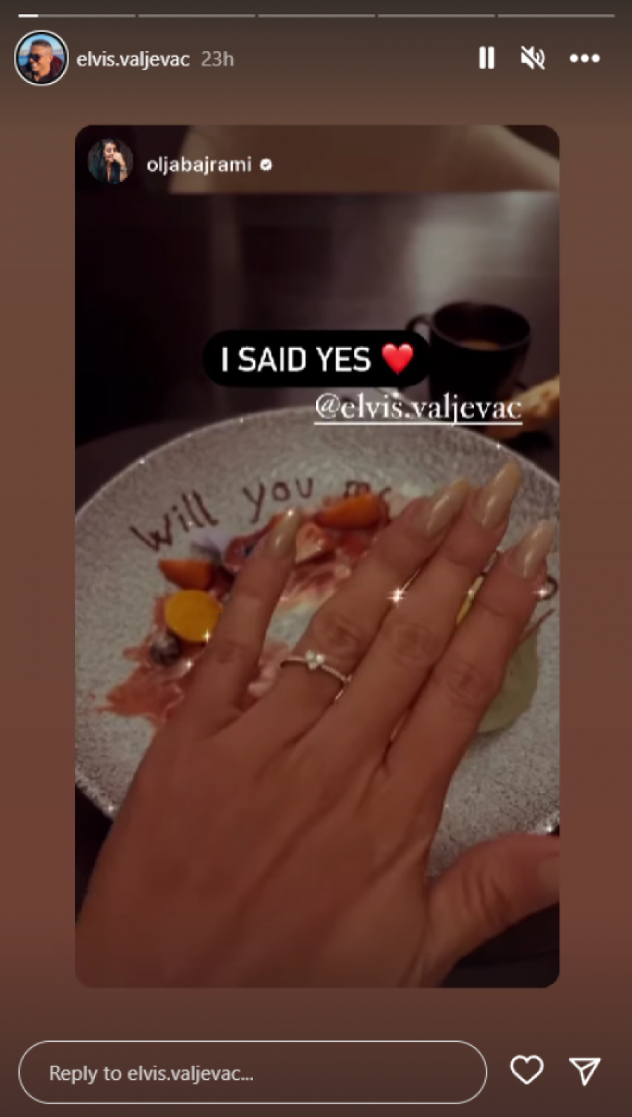 Bivša zadrugarka i pevačica Olja Bajrami se potpuno povukla iz javnog života i krije svoj privatni život. Ipak, srećne vesti je morala da podeli sa svojim fanovima i pratiocima na društvenoj mreži Instagram. Naime, Olju je danas verio njen izabranik, a ona je pristala da se uda za njega.