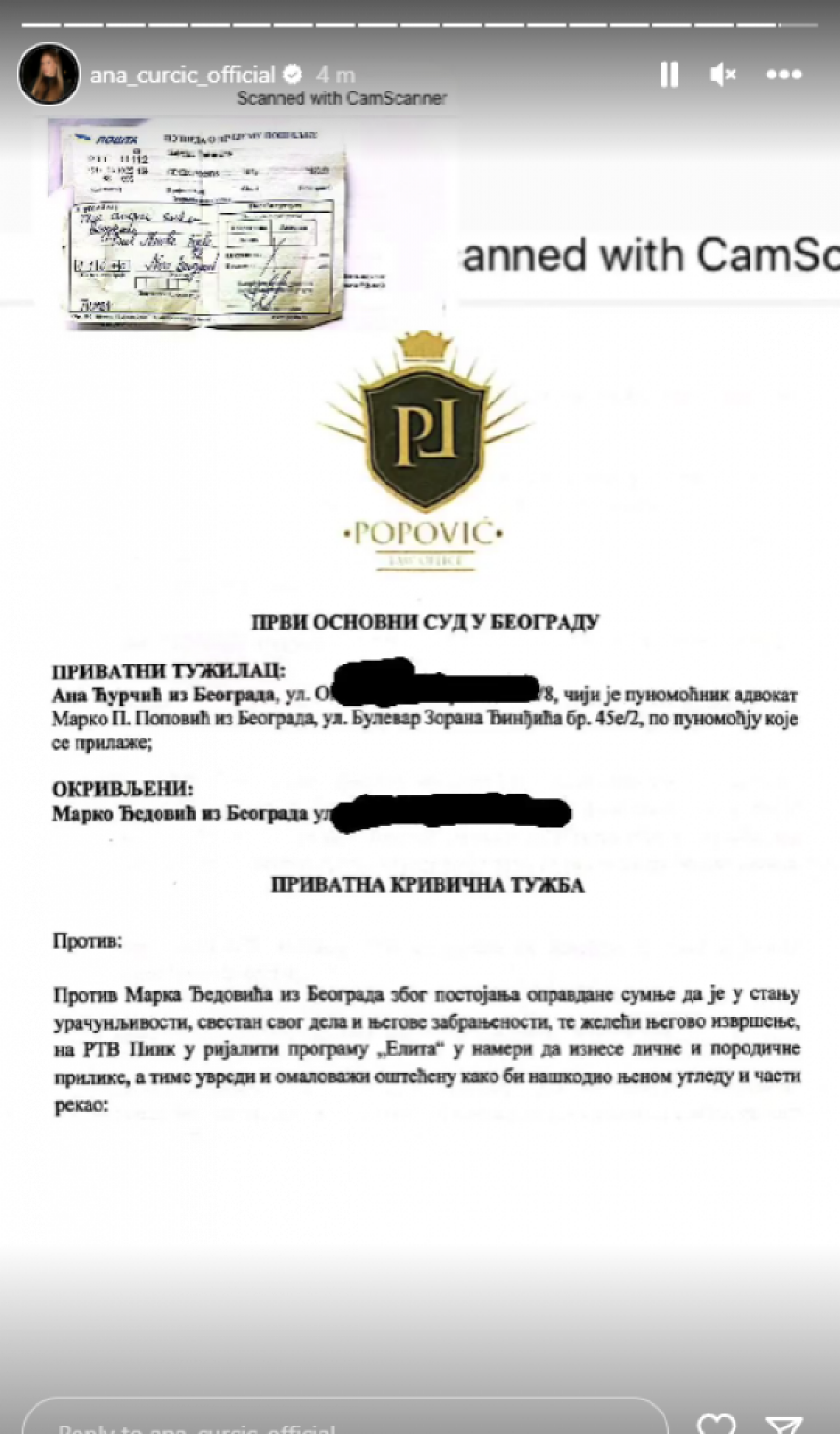 Bivša zadrugarka Ana Ćurčić na Instagram profilu objavila je zvaničan papir iz suda da je podnela dve privatne krivične tužbe protiv Milene Kačavende i Marka Đedovića.