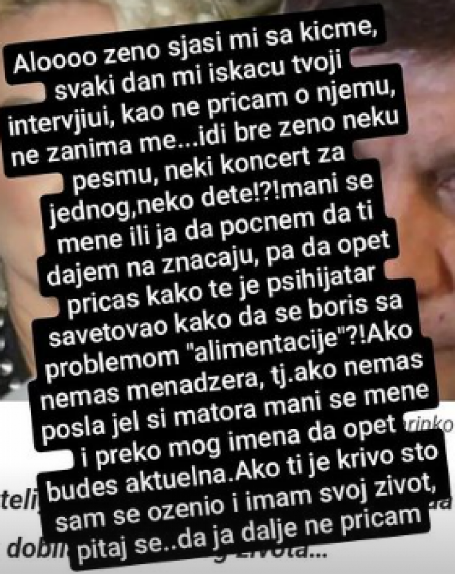 - Alo ženo, sjaši mi sa kičme, svaki dan mi iskaču tvoji intervjui, kao ne pričam o njemu, ne zanima me... Idi bre ženo neku pesmu, neki koncert za jednog, neko dete?! Mani se mene ili ja da počnem da ti dajem na značaju, pa da opet pričaš kako te je psihijatar savetovao kako da se boriš sa problemom ,,alimentacije"? Ako nemaš menadžera, tj. ako nemaš posla, jer si matora, mani se mene i preko mog imena da opet budeš aktuelna. Ako ti je krio što sam se oženio i imam svoj život, pitaj se, da ja dalje ne pričam - napisao je Ivan Marinković na Instagramu.