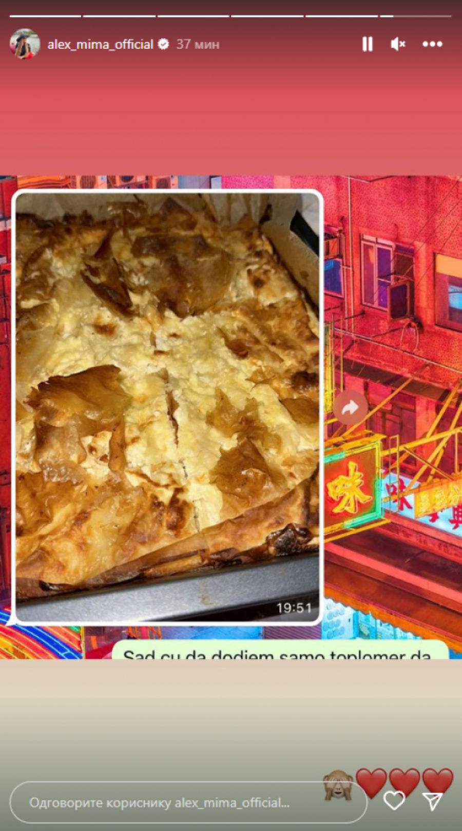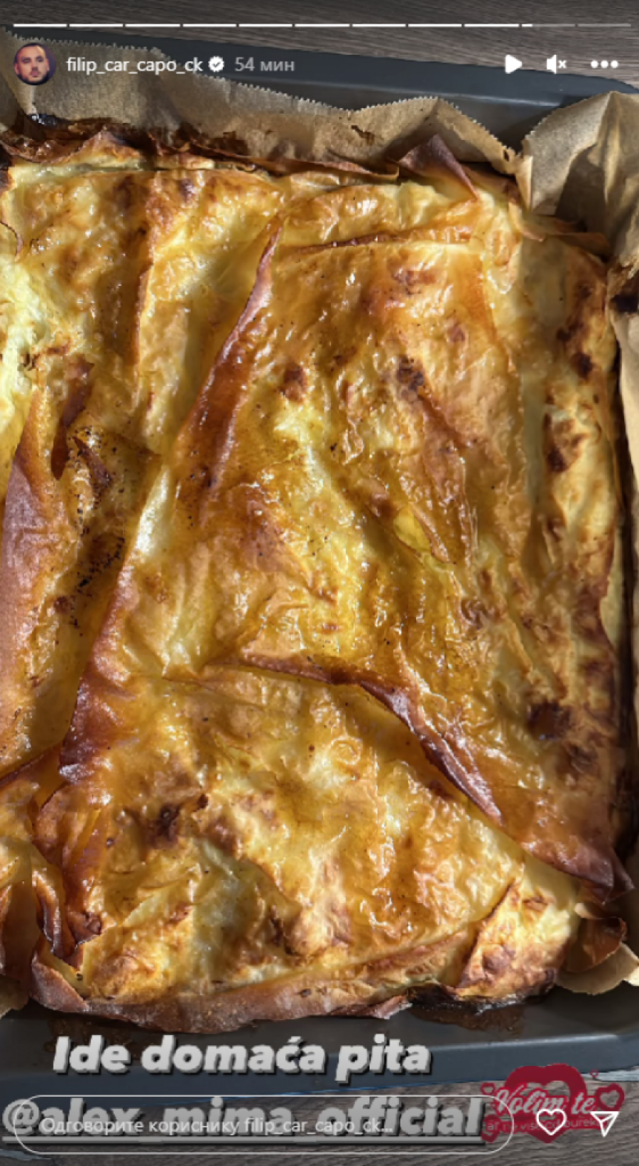 Kako bi se što pre oporavila Filip je odlučio da joj napravi pravi ugođaj, pa je pokazao da je ozbiljan kuvar i za nju ispekao domaću pitu. On je fotografiju poslao Aleksandri kako bi je iznenadio, jer očigledno u tom momentu nisu bili zajedno, a ona je njihovo dopisivanje objavila na svom Instagram profilu.