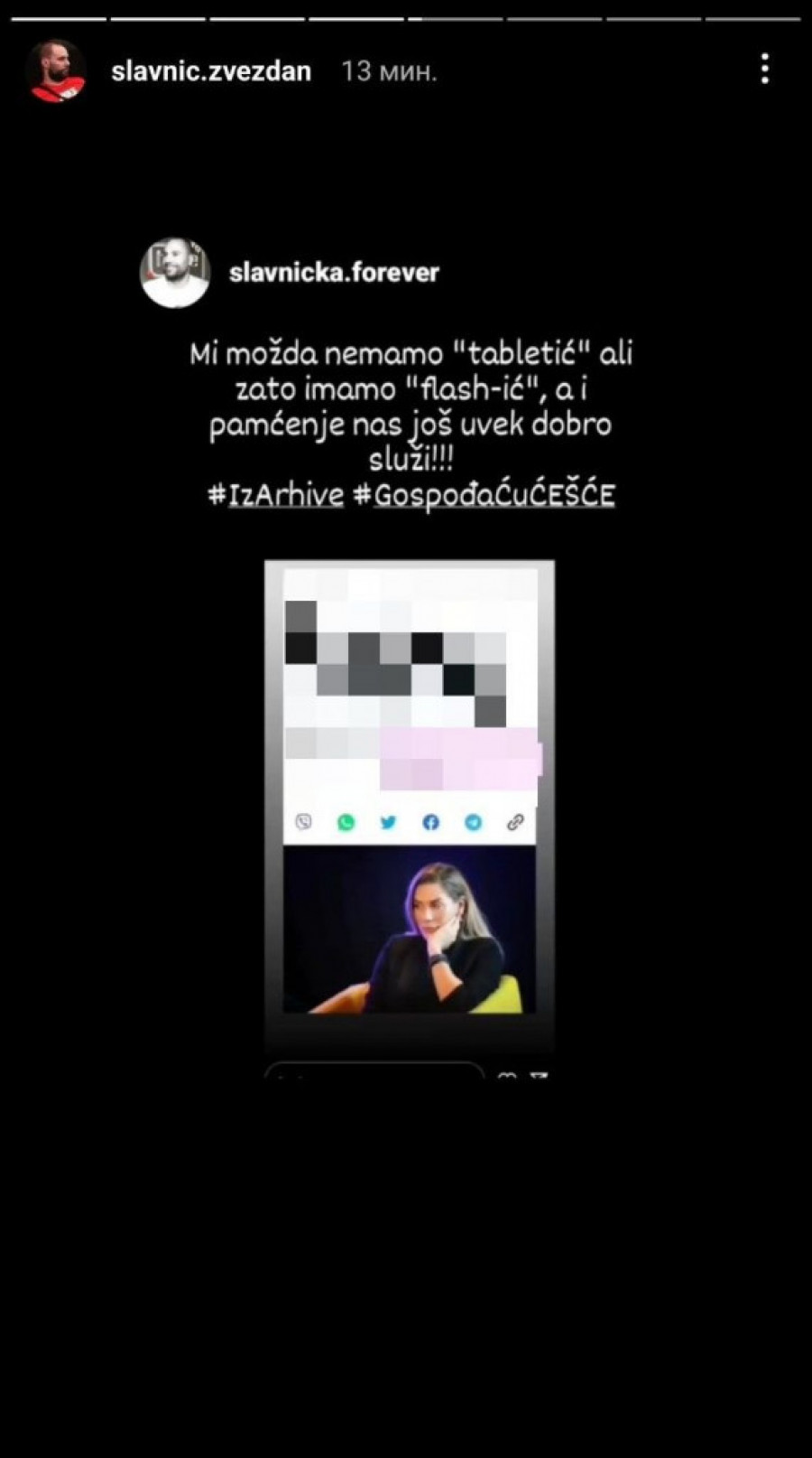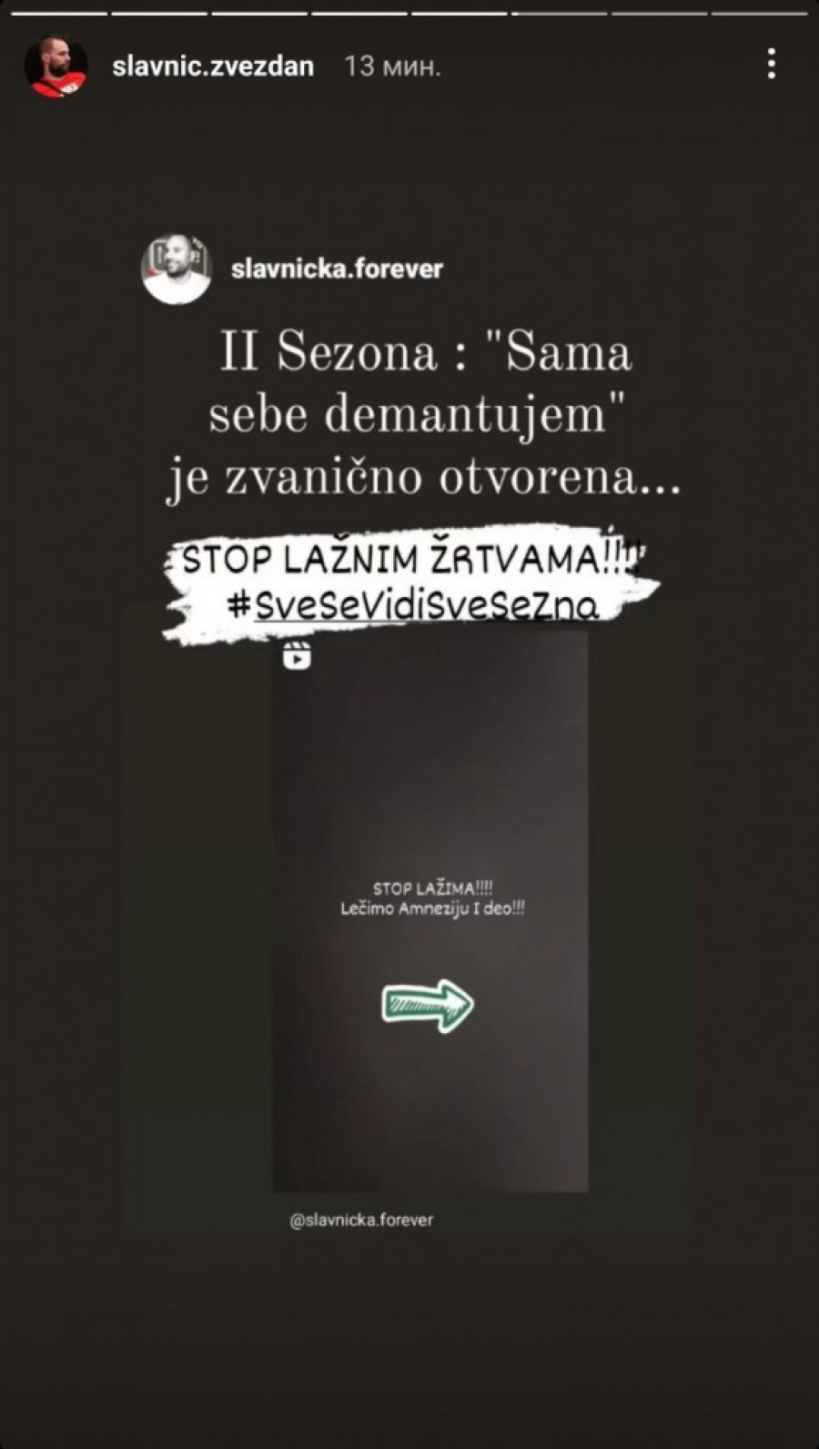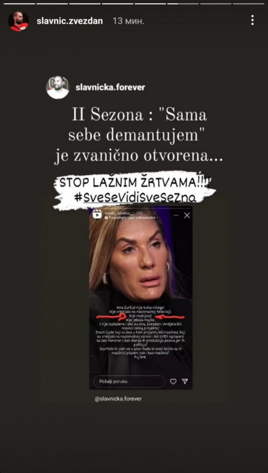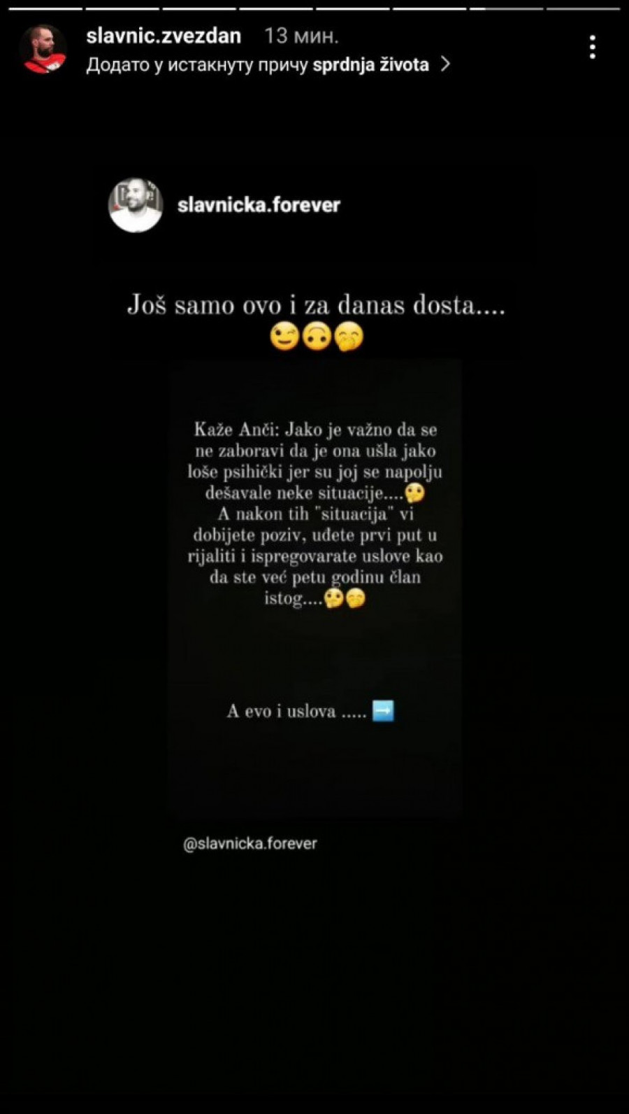 - Ja možda nemam "tabletić", ali zato imam "fešić", a i pamćenje me još uvek dobro služi. Još samo ovo i za danas dosta... Kaže Anči: "Jako je važno da se ne zaboravi da je ona ušla jako loše psihički jer su joj se napolju dešavale neke situacije... A nakon tih "situacija" vi dobijete poziv, uđete prvi put u rijaliti ispregovarate uslove kao da ste već petu godinu član istog. Druga sezona "sama sebe demantujem" je zvanično otvorena... Stop lažnim žrtvama! Sve se vidi, sve se zna - stoji u Slavnićevoj objavi koja je sve šokirala.