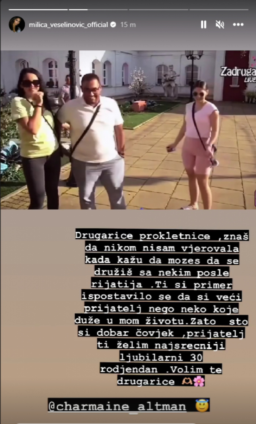 - Drugarice, prokletnice, znaš da nikom nisam verovala kada kažu da možeš da se družiš sa nekim posle rijaltija. Ti si primer ispostavilo se da si veći prijatelj nego neko ko je duže u mom životu. Zato što si dobar čovek, prijatelj. Želim ti najsrećniji ljubiralni 30. rođendan. Volim te, drugarice - napisala je Milica Veselinović na Instagramu.