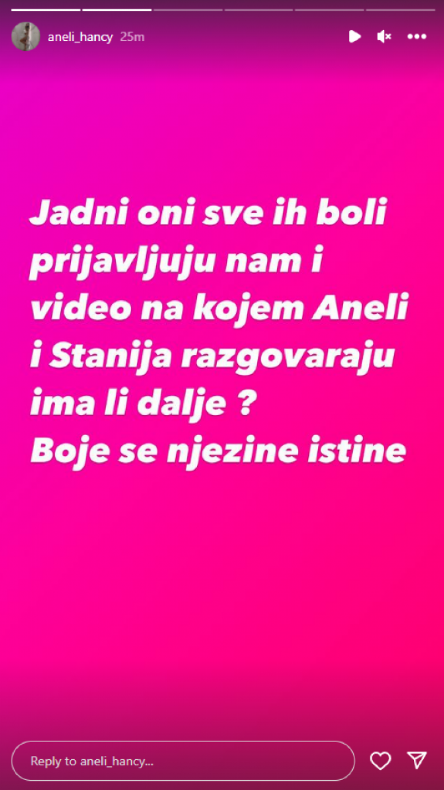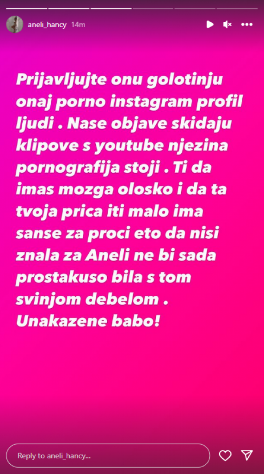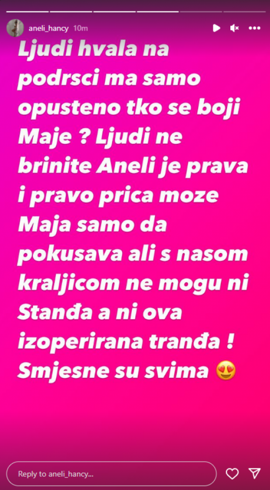 - Jadni oni sve ih boli prijaljuju nam i video na kojem Aneli i Stanija razgovaraju, ima li dalje? Boje se njene istine. Prijavljujte onu golotinju, onaj porno Instagram profil, ljudi. Naše objave skidaju klipove s Youtube-a, njena pornografija stoji. Ti da imaš mozga, ološu i da ta tvoja priča ima malo šanse prići, eto da nisi znala ta Aneli ne bi sad prostakušo bila s tom svinjom debelom. Unakažena babo! Ljudi, hvala vam na podršci, ma samo opupteno ko se boji Maje? Ljudi ne brinite Aneli je prava i prava priča, može Maja samo da pokušava ,ali sa našom kraljicom ne mogu ni Standža, a ni ova izoperisana tandža. Smešne su svima - glasila je poruka koja se našla na Instagram profilu Aneli Ahmić.