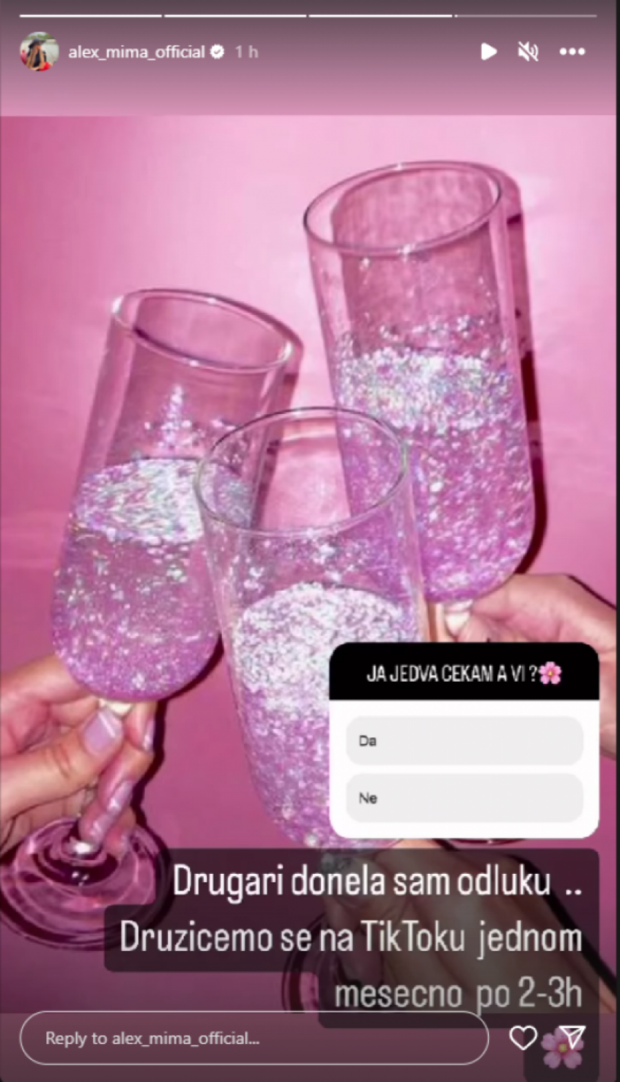 Aleksandra Nikolić, poznata kao pobednica šeste sezone rijalitija “Zadruga”, nedavno je na svom Instagram profilu objavila da će se sa svojim pratiocima družiti samo jednom mesečno. Ova odluka je iznenadila mnoge, ali Aleksandra je objasnila da želi da održi kvalitet svoje interakcije sa fanovima.