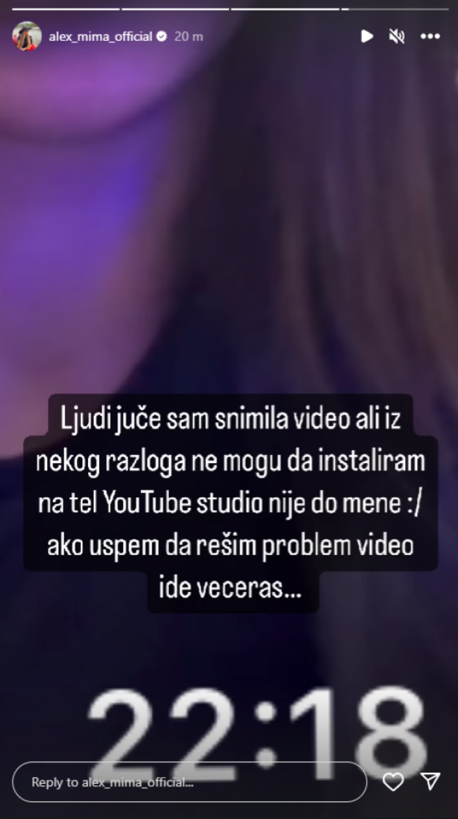 - Ljudi, juče sam snimila video, ali iz nekog razloga ne mogu da instaliram na telefon Jutjub studio nije do mene. Ako uspem da rešić problem, video ide večeras - napisala je Aleksandra Nikolić na Instagramu.