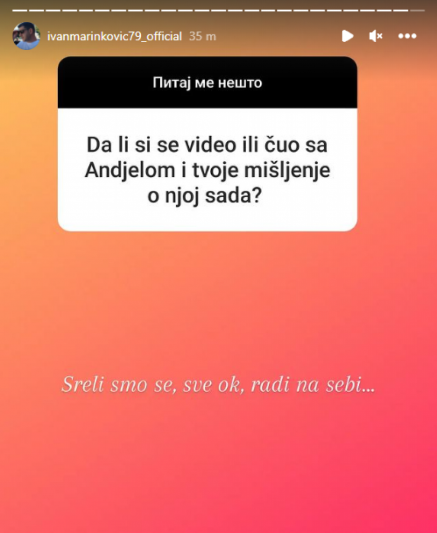 Ivan Marinković, poznat po svom učešću u rijaliti programu "Zadruga", nedavno je bio upitan o susretu sa starletom Anđelom Đuričić. Na iznenađenje mnogih, Ivan je otkrio da su se njih dvoje zaista sreli i da je njegovo mišljenje o njoj sada veoma pozitivno.