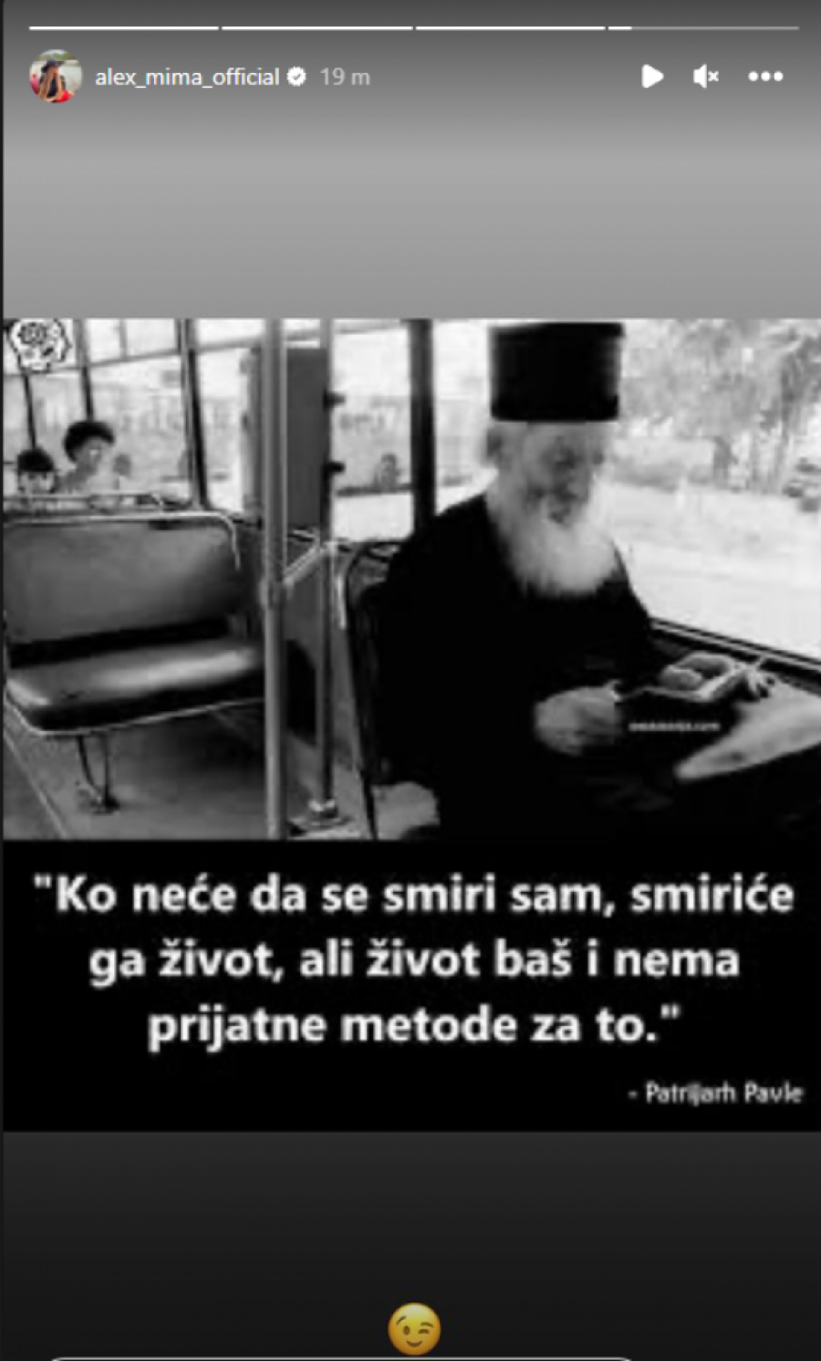 - Ko neće da se smiri sam, smiriće ga život, ali život baš i nema prijatne metode za to - glasila je poruka koju je podelila Aleksandra na Instagramu, a ispod nje je ostavila emotikon koji namiguje, koji inače ljudi koriste kako bi nekom uputili jasnu poruku, provokaciju, ili kada žele da najave neku vrstu osvete.