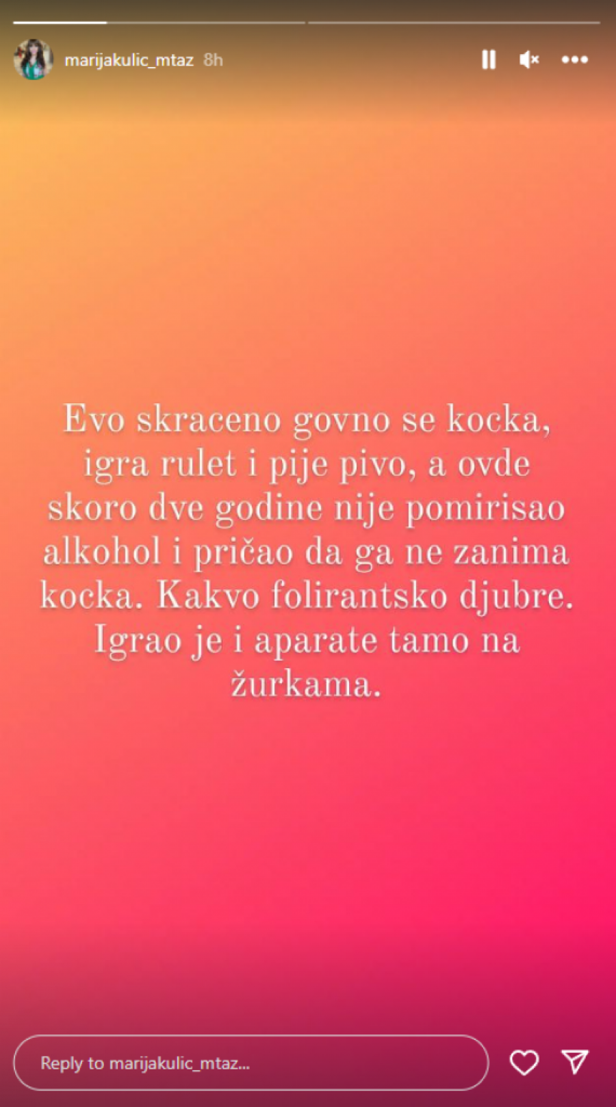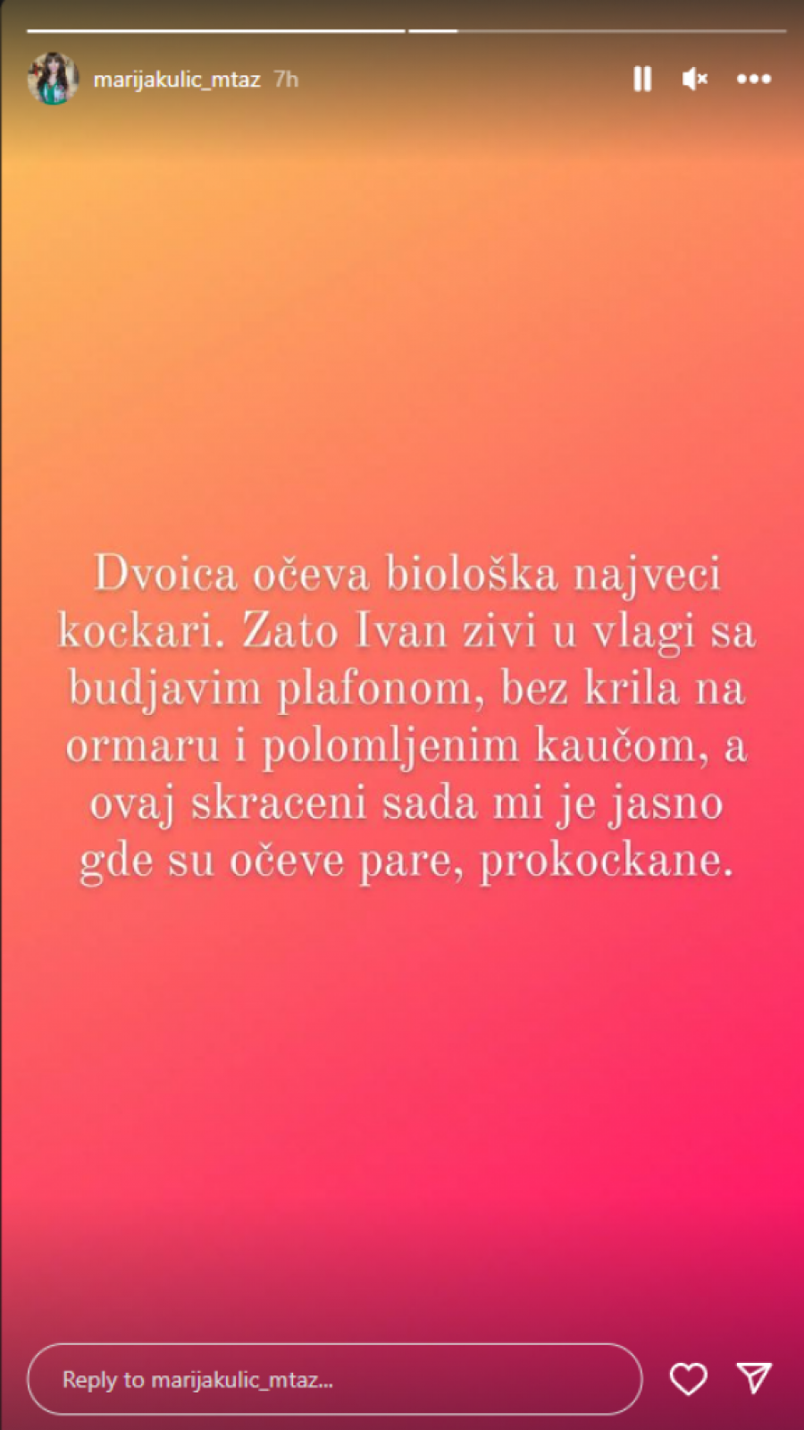 - Evo skraćeno g*vno(Bebica) se kocka i pije pivo, a ovde skoro dve godine nje pomirisao alkohol i pričao da ga ne zanima kocka. Kakvo folirantsko đubre. Igrao je i aparate tamo na žurkama. Dva biološka oca najveći kockari. Zato Ivan živi u vlagi sa buđavim plafonom, bez krila na ormanu i polomljenim kaučom, a ovaj skraćeni sada mi je jasno gde su očeve pare, prokockane - glasila je objava Marije Kulić na društvenoj mreži Instagram.