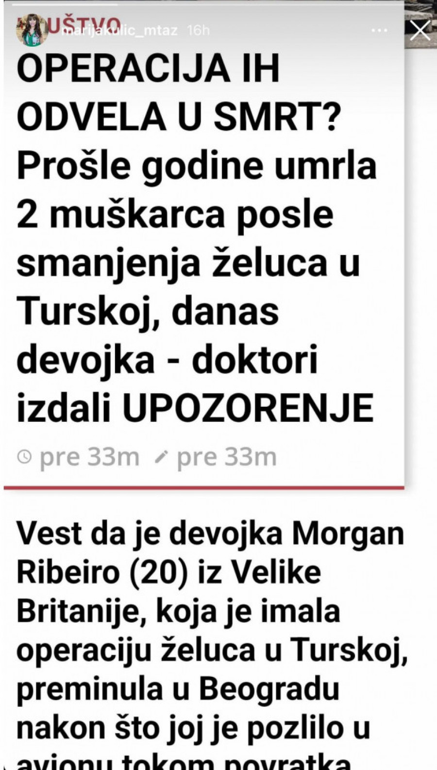 Jedna od najpoznatijih učesnica rijaliti programa "Zadruga", Marija Kulić, izazvala je buru reakcija na društvenim mrežama kada je javno izrazila svoju zabrinutost za zdravstveno stanje svoje ćerke Miljane. Na svom Instagram profilu, Marija je podelila fotografiju istraživanja o broju ljudi koji su preminuli usled komplikacija nakon operacije želuca, iste vrste operacije kojoj je Miljana bila podvrgnuta. Foto: Instagram.com