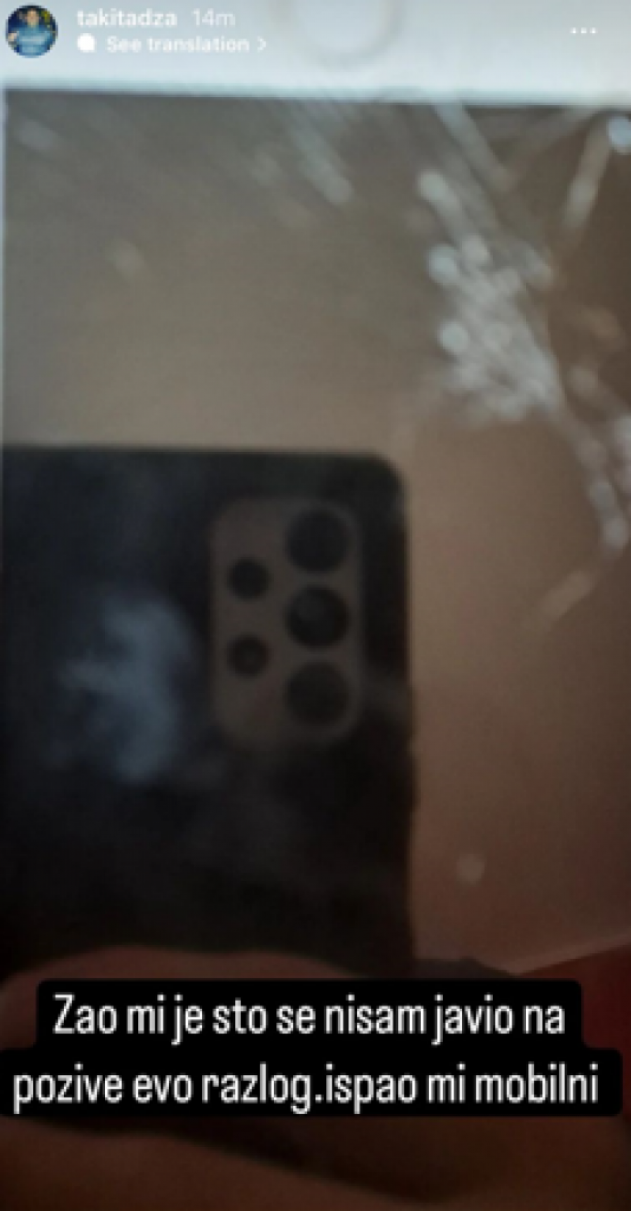- Žao mi je što se nisam javio na pozive, evo šta je razlog. Ispao mi je mobilni - napisao je Taki i fotografisao polomljen telefon, koji je u međuvremenu očigledno i zamenio.