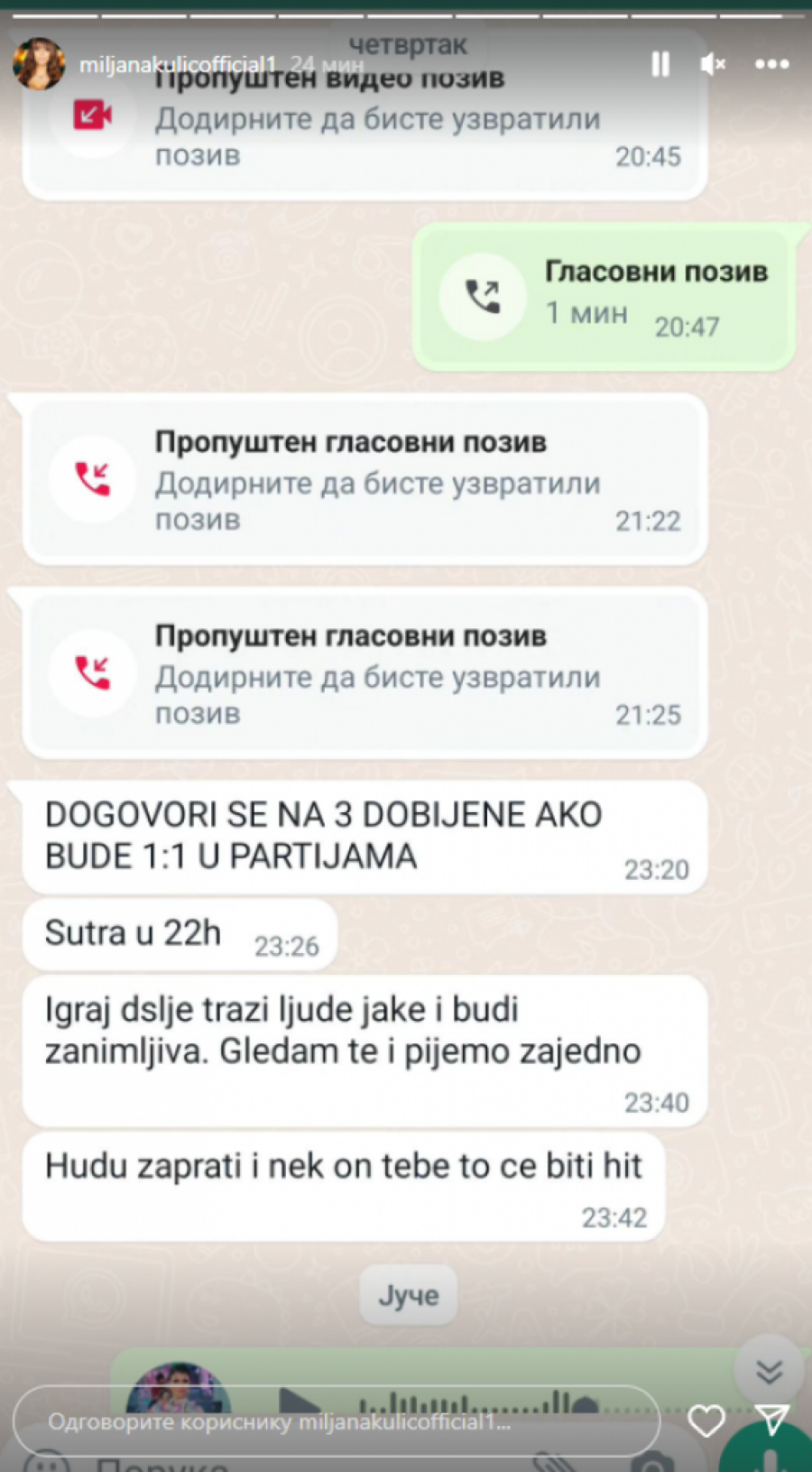 Sada je odlučila da dokaže istinu o njihovom odnosu, kao i tajnom dogovoru sa Zolom. Kako se jasno može pročitati u novim prepiskama, koje je Miljana obelodanila, Zola joj je davao upustva za zaradu na TikToku, pa joj objasnio kakve protivnike da bira.