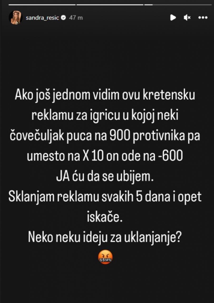 Poznata pevačica Sandra Rešić izazvala je uznemirenje među svojim pratiocima na društvenoj mreži Instagram objavom potresne poruke. Naime, Sandra je izrazila svoje nezadovoljstvo zbog učestalih reklama za jednu igricu koja konstantno iskače dok koristi popularnu platformu.