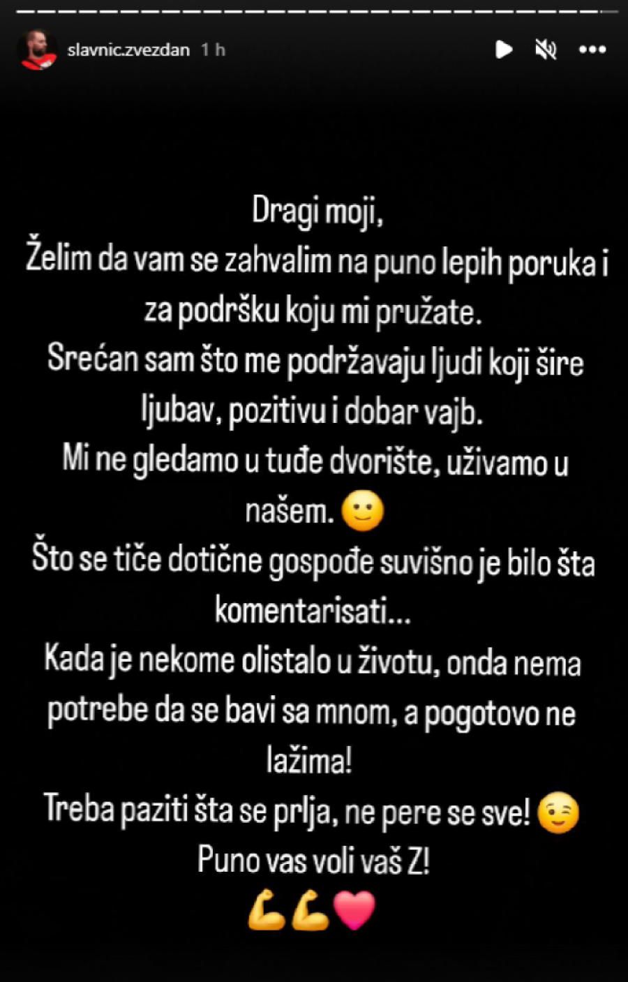 U svom statusu, Slavnić je napisao: „Dragi moji, želim da vam se zahvalim na puno lepih poruka i za podršku koju mi pružate. Srećan sam što me podržavaju ljudi koji šire ljubav, pozitivu i dobar vajb. Mi ne gledamo u tuđe dvorište, uživamo u našem.“ Ovim rečima, Slavnić je istakao važnost pozitivne energije i podrške koju dobija od svojih pratioca.