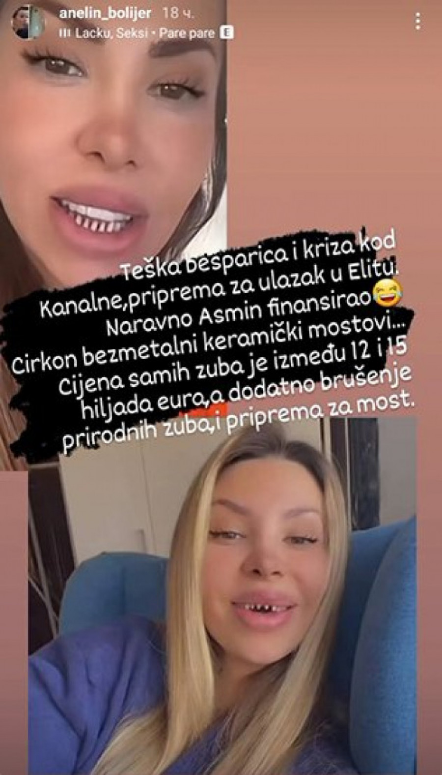 Aneli Ahmić jedna od učesnica rijaliti programa "Elita", privlači pažnju svojim atraktivnim izgledom. Nedavno je postala tema interesovanja nakon što je na društvenoj mreži Instagram osvanula fotografija njenih zuba tokom procesa stavljanja novih.