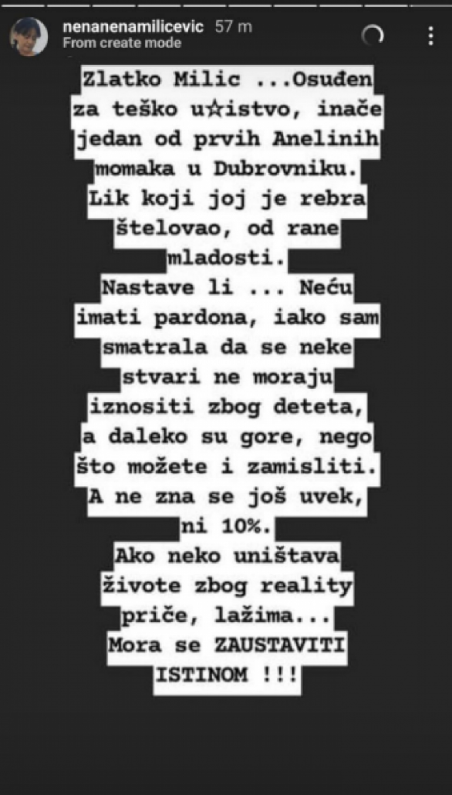 - Zlatko Milić, osuđen za teško ubistvo, inače jedan od prvih Anelinih momaka u Dubrovniku. Lik koji joj je rebra štelovao, od rane mladosti. Nastave li... Neću imati pardona, iako sam smatrala da se neke stvari ne moraju iznositi zbog deteta, a daleko su gore, nego što možete i zamisliti. A ne zna se još uvek, ni 10 posto. Ako neko uništava živote zbog rijaliti priče, laži, mora se zaustaviti istinom - stoji na statusu koji je izvesna Nena napisala.