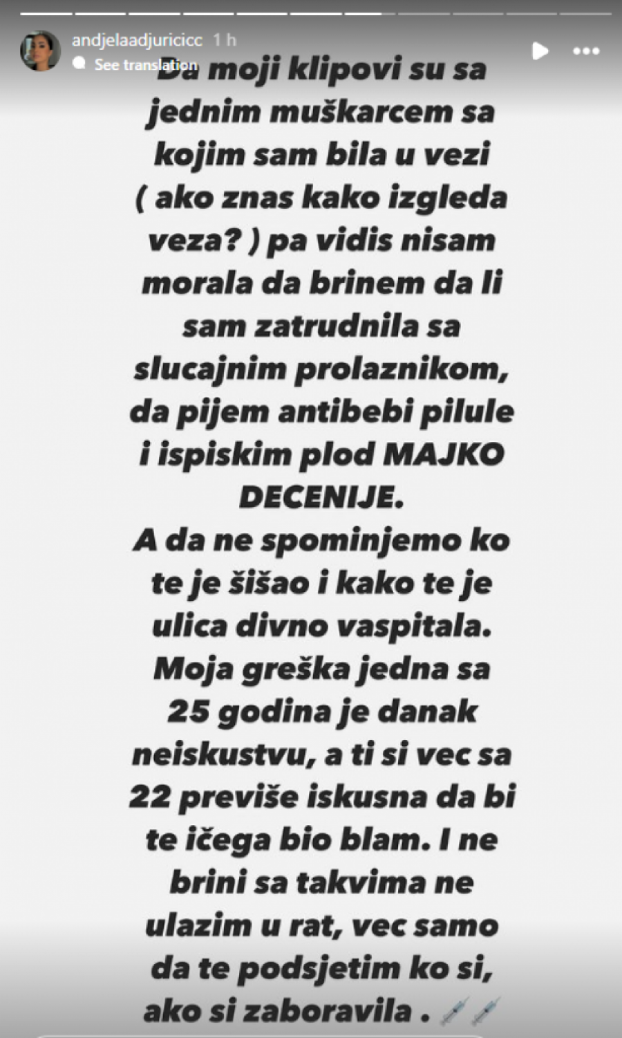 - Da, moji klipovi su sa jednim muškarcem sa kojim sam bila u vezi, ako znaš kako izgleda veza? Pa vidiš nisam morala da brinem da li sam zatrudnela sa slučajnim prolaznikom, da pijem antibebi pilule i ispiškim plod majko decenije. A da ne spominjemo ko te je šišao i kako te je ulica divno vaspitala. Moja greška jedna sa 25 godina je danak neiskustvu, a ti si već sa 22 previše iskusna da bi te ičega bio blam. I ne brini sa takvima ne ulazim u rat, već samo da te podsetim ko si, ako si zaboravila - napisala je Anđela Đuričić na Instagram profilu.