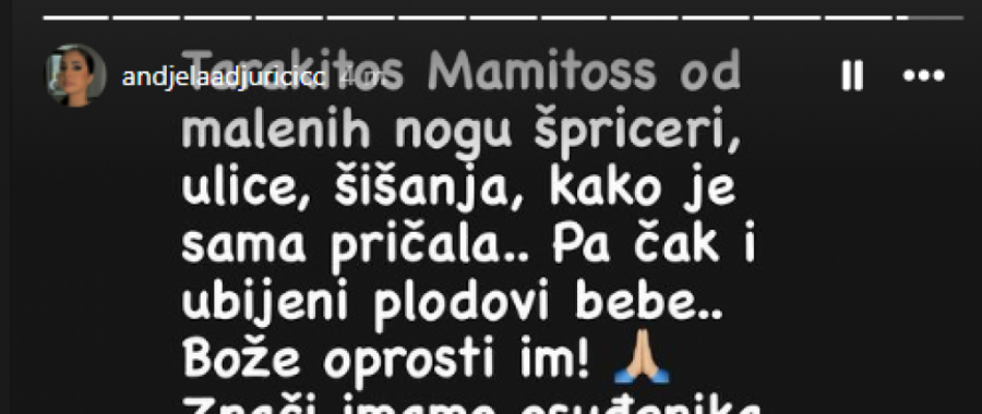 - Tarakitos mamitos od malenih nogu šriceri, ulice, šišanja, kako je sama pričala... Pa čak i ubijeni plodovi bebe... Boži oprosti im! - napisala je Anđela Đuričić na Instagramu.