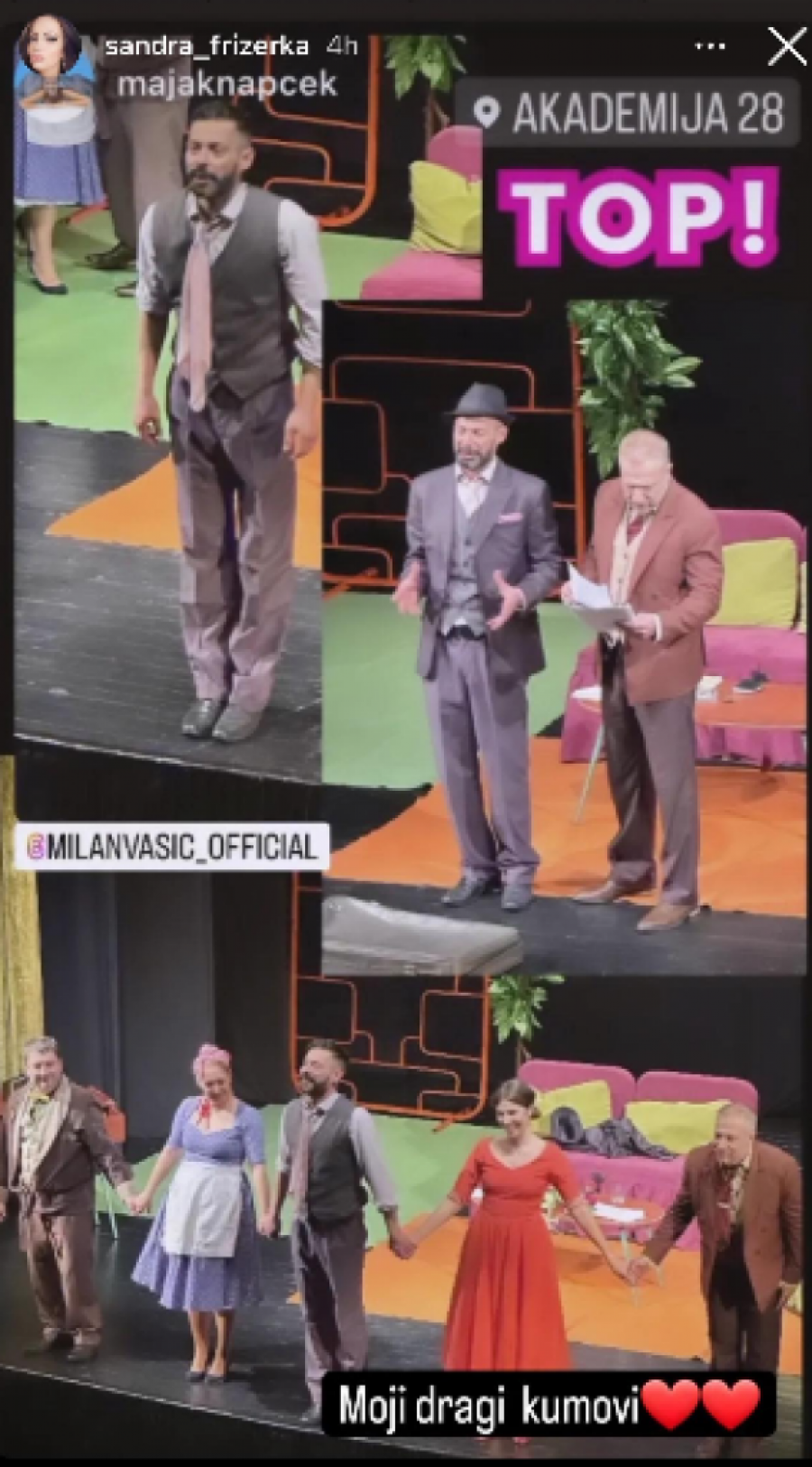 Na Instagram profilu Aleksandre Šparavalo nedavno se pojavila neobična informacija koja je izazvala veliku pažnju javnosti. Naime, majka popularne rijaliti učesnice Anđele Šparavalo objavila je da je njen kum poznati glumac Milan Vasić. Ova vest je iznenadila mnoge, a otkriveno je da je Aleksandra javno progovorila o njihovom rodbinskom odnosu baš u trenutku kada je gledala Vasićevu predstavu. Foto: Instagram.com