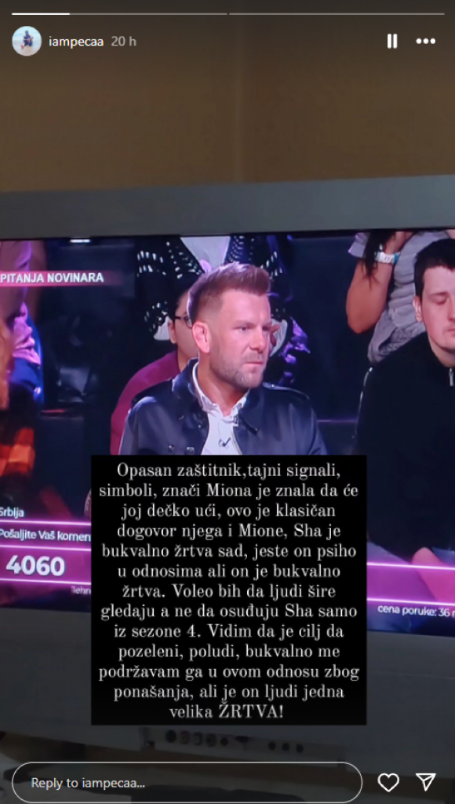 - Opasan zaštitnik, tajni signali, simboli, znači Miona je znala da će joj dečko ući, ovo je klasičan dogovor njega i Mione, Ša je bukvalno žrtva sad, jeste on psiho u odnosima, ali on je bukvalno žrtva. Voleo bih da ljudi šire gledaju, a ne da osuđuju Ša samo iz sezone4. Vidim da je cilj da pozeleni, poludi, bukvalno me podržavam ga u ovom odnosu zbog ponašanja, ali je on ljudi jedna velika žrtva - napisao je Neca na Instagramu.