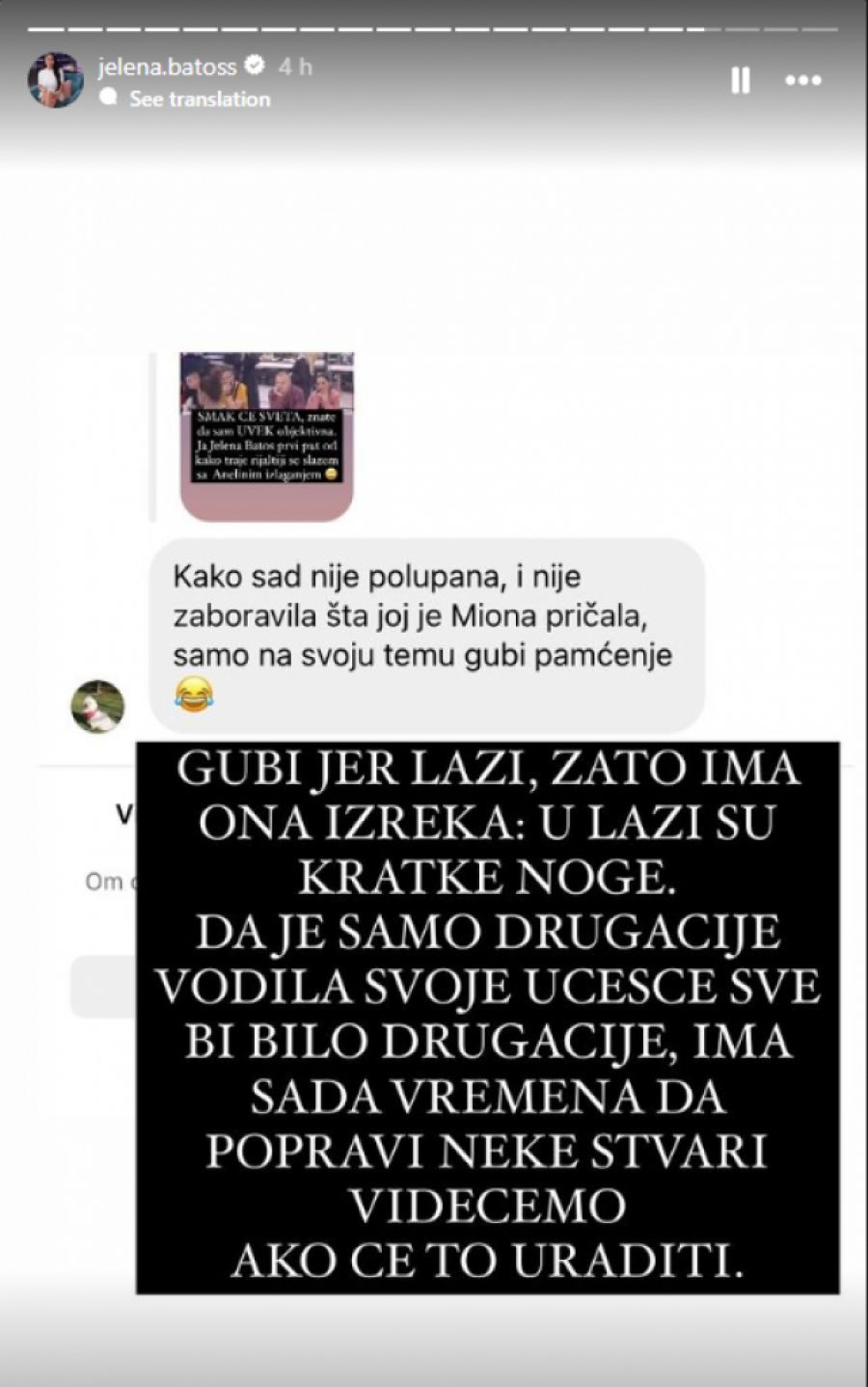 - Gubi, jer laže, zato ima ona izreka: ,,U laži su kratke noge". Da je samo drugačije vodila svoje učešće sve bi bilo drugačije, ima sada vremena da popravi neke stvari videćemo. Ako će to uraditi - napisala je Jelena na komentar koji je dobila kao odgovor na stori koji glasi: