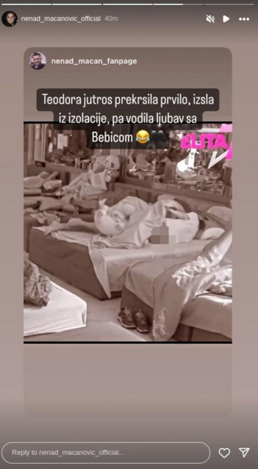 - Teodora jutros prekršila pravilo, izašla iz izolacije, pa vodila ljubav sa Bebicom - stoji u opisu slike. Foto: Instagram.com