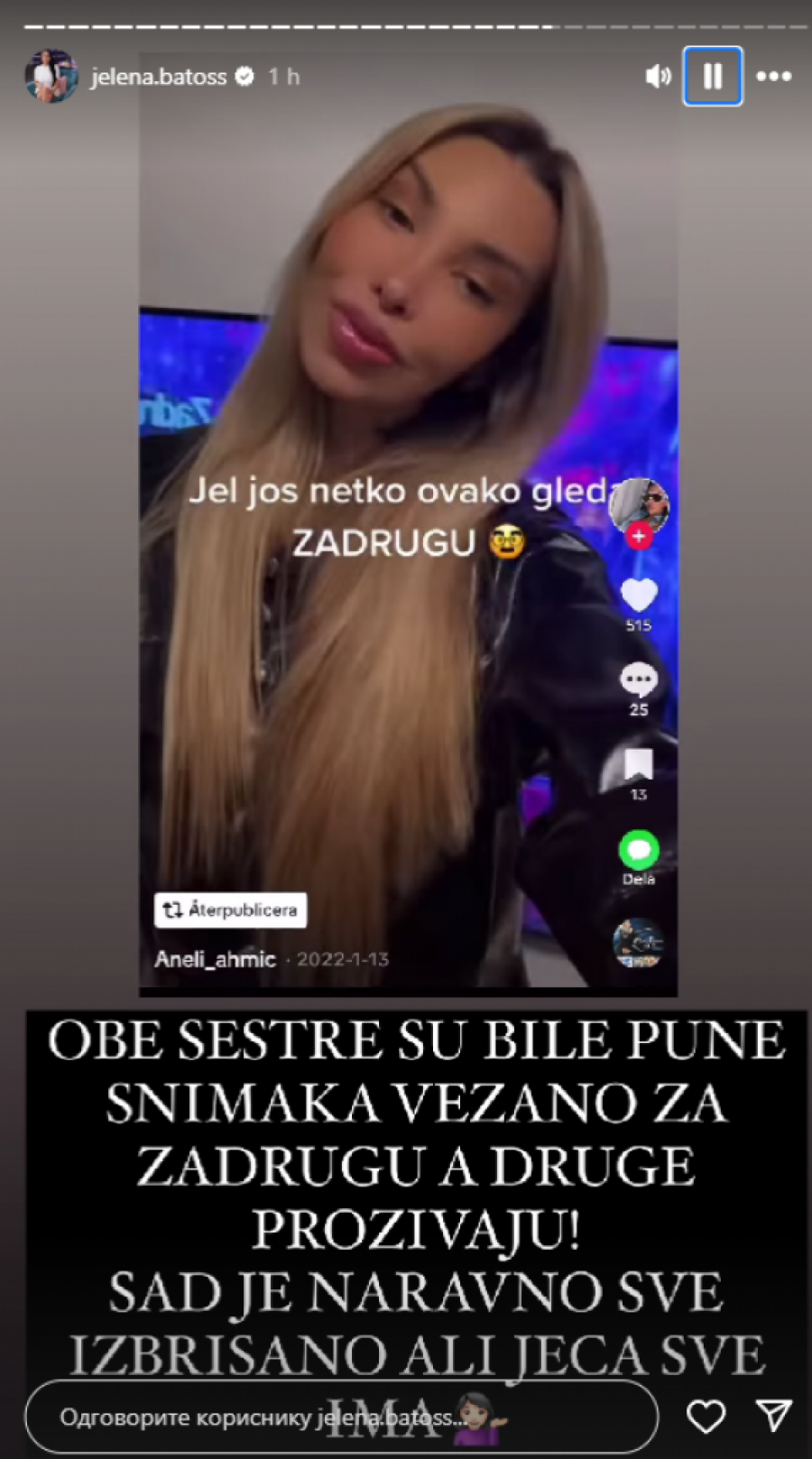 Anelina sestra, Sita Ahmić, takođe nema lepe reči za Maju, što se videlo i u čestitki koju je poslala povodom proslave Bajrama. Međutim, izgleda da one nisu ranije imale tako grozno mišljenje o Maji, a prvo stanje pokazala je bivša zadrugarka, Jelena Batos, koja je na svom storoiju na društvenoj mreži Instagram podelila klipove sa TikTok-a na kojima su se Aneli i Sita snimale uz izjave Maje Marinković.