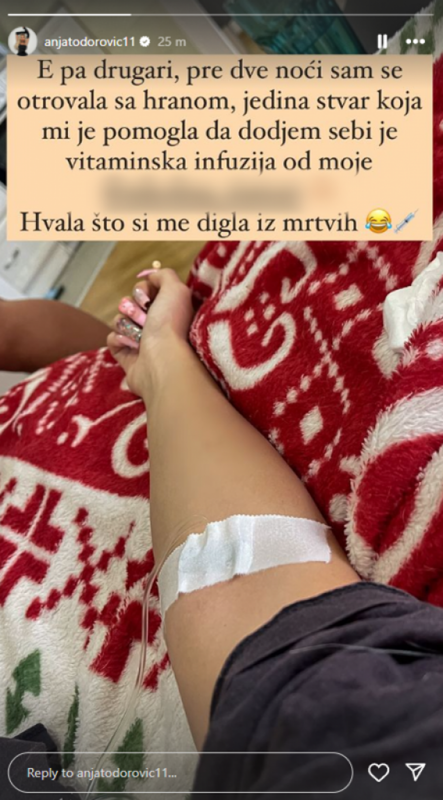 - E pa drugari, pre dve noći sam se otrovala sa hranom, jedina stvar koja mi je pomogla da dođem sebi, jer vitaminska infuzija me je digla iz mrtvih - napisala je Anja Todorović na Instagramu.