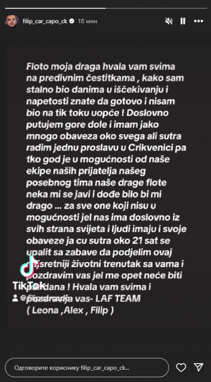 - Floto moja draga hvala vam svima predivnim čestitkama. Kako sam stalno bio danima u iščekivanju i napetosti, znate da gotovo i nisam bio na TikToku uopšte! Doslovno putujem gore - dole i imam jako mnogo obaveza oko svega, ali radim jednu proslavu u Crikvenici, pa ko god je u mogućnosti od naše ekipe, naših prijatelja, našeg posebnog tima, naše drage flote, neka mi se javi i dođe, bilo bi mi drago... Za sve one koji nisu u mogućnosti, jer nas ima doslovno sa svih strana sveta i ljudi imaju i svoje obaveze, ja ću oko 21h da se upalim sa zabave, da podelim ovaj najsrećniji životni trenutak sa vama i pozdravim vas, jer me opet neće biti par dana! Hvala vam svima i pozdravlja vas LAF TIM ( Leona, Aleks, Filip) - napisao je Filip prošle noći.