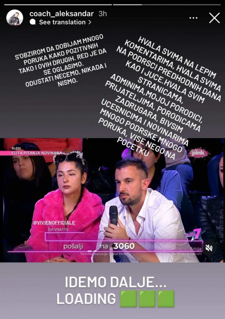 - S obzirom da dobijam mnogo poruka kako pozitivnih, tako i ovih drugih. Red je da se oglasim. Odustati nećemo, nikada i nismo! Hvala svima na lepim komentarima, hvala svima na podršci prethodnih dana... Hvala svim stranicama, adminima, mojoj porodici, prijateljima, porodicama zadrugara, bivšim učesnicima, mnogo podrške, mnogo poruka, više nego na početku - napisao je Aleksandar na Instagram storiju.