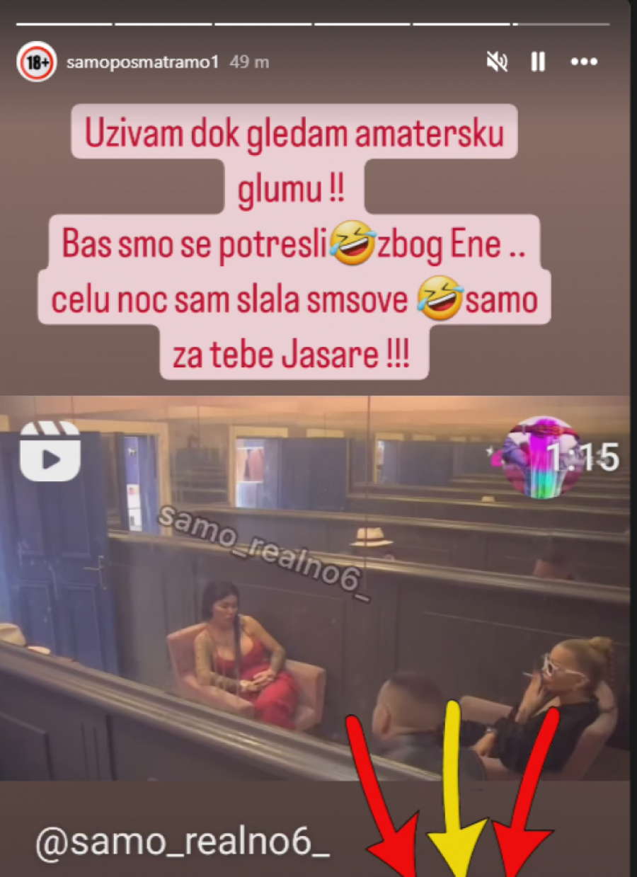 - Uživam dok gledam amatersku glumu! Baš smo se potresli zbog Ene... Celu noć sam slala SMS-ove, samo za tebe Jašare - stoji na Instagram storiju jedne stranice koja se bavi raskrinkavanjem takmičara rijalitija ,,Elita".